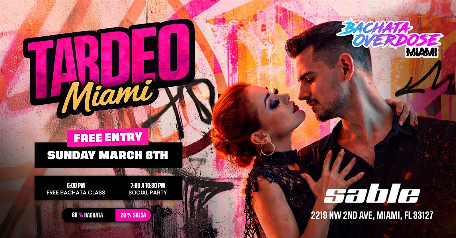 by admin27Feb ‼️MIAMI TARDEO BACHATA SOCIAL : SUNDAY MARCH 8TH at Sable – Miami, FL ‼️MIAMI TARDEO BACHATA SOCIAL : SUNDAY MARCH 8TH at Sable – Miami, FL 1 1 people viewed this event. MIAMI‼️ GET READY FOR OUR BRAND NEW BACHATA SOCIAL IN THE HEART OF ICONIC WYNWOOD. COME MEET PEOPLE FROM ALL OVER THE WORLD WHILE DANCING Tickets-RSVP Link Date And Time Sunday, March 8th, 2026 06:00 PM (PST) Venue Sable Location 2219 Northwest 2nd Avenue, Miami, FL 33127 Event Types MusicParty or Social Gathering Event Category FloridaMiami Share With Friends Facebook Twitter Linkedin Xing Pinterest Share This Post: