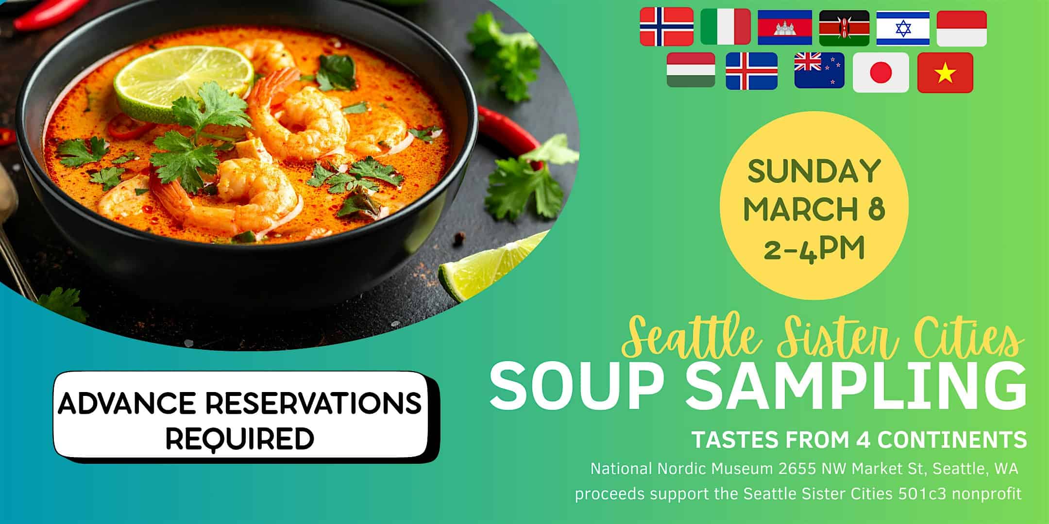 by admin23Feb 2nd annual Seattle Sister Cities’ Soup Sampling at National Nordic Museum – Seattle, WA 2nd annual Seattle Sister Cities’ Soup Sampling at National Nordic Museum – Seattle, WA 1 1 people viewed this event. The Soup Sampling is an annual event sponsored by the Seattle Sister Cities Association in partnership with the National Nordic Museum Tickets-RSVP Link Date And Time Sunday, March 8th, 2026 @ 02:00 PM Location 2655 Northwest Market Street, Seattle, WA 98107 Event Types Food & DrinkParty or Social Gathering Event Category SeattleWashington Share With Friends Facebook Twitter Linkedin Xing Pinterest Share This Post: