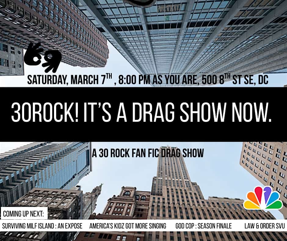 by admin14Feb 30ROCK: IT’S A DRAG SHOW NOW! at 500 8th St SE – Washington, DC 30ROCK: IT’S A DRAG SHOW NOW! at 500 8th St SE – Washington, DC 1 1 people viewed this event. An imaging of the 30Rock gang in the AI age. A fan fic drag show, featuring Muffin Top, Werewolf Bar Mitzvah, & a love of human creativity Tickets-RSVP Link Date And Time Sunday, March 8th, 2026 01:00 AM (PST) Venue 500 8th St SE Location 500 8th Street Southeast, Washington, DC 20003 Event Types Concert or PerformancePerforming & Visual Arts Event Category Washington DC Share With Friends Facebook Twitter Linkedin Xing Pinterest Share This Post: