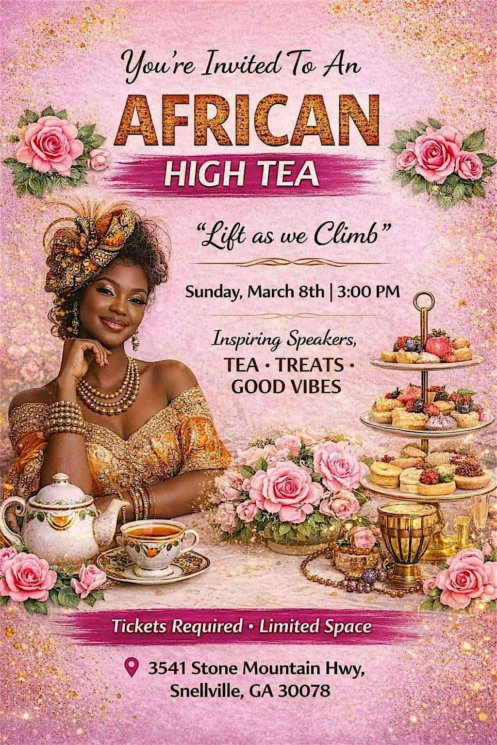 by admin14Feb Afro High Tea at 3541 Stone Mountain Hwy – Snellville, GA Afro High Tea at 3541 Stone Mountain Hwy – Snellville, GA 1 1 people viewed this event. Sip some tea, vibe with great company, and celebrate Afro culture in a sophisticated setting. Tickets-RSVP Link Date And Time Sunday, March 8th, 2026 07:00 PM (PST) Venue 3541 Stone Mountain Hwy Location 3541 Stone Mountain Highway, Snellville, GA 30078 Event Types Community & CultureParty or Social Gathering Event Category AtlantaGeorgia Share With Friends Facebook Twitter Linkedin Xing Pinterest Share This Post: