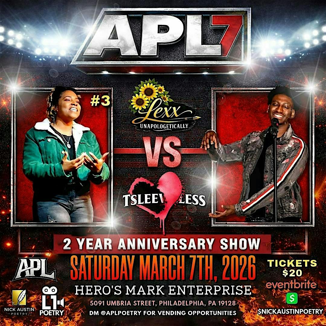 by admin13Feb APEX POETRY LEAGUE 7: LEXX UNAPOLOGETICALLY VS TSLEEVELESS at Hero’s Mark Enterprise – Philadelphia, PA APEX POETRY LEAGUE 7: LEXX UNAPOLOGETICALLY VS TSLEEVELESS at Hero’s Mark Enterprise – Philadelphia, PA 1 1 people viewed this event. Apex Poetry League 2-Year Anniversary Showdown w/ Lexx Unapologetically vs Tsleeveless Tickets-RSVP Link Date And Time Sunday, March 8th, 2026 12:00 AM (PST) Venue Hero's Mark Enterprise Location 5091 Umbria Street, Philadelphia, PA 19128 Event Types Music Event Category PennsylvaniaPhiladelphia Share With Friends Facebook Twitter Linkedin Xing Pinterest Share This Post: