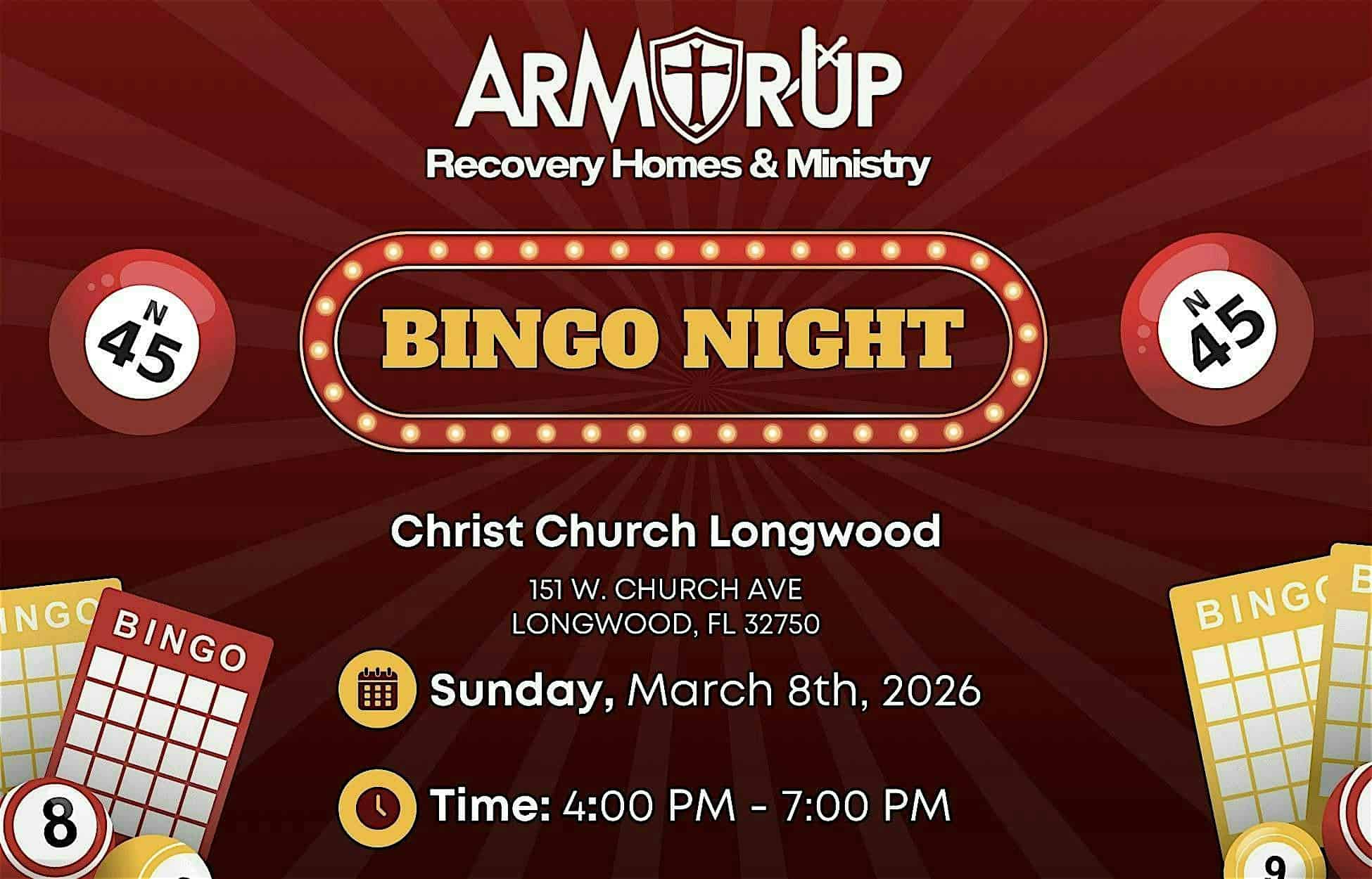 by admin23Feb Armor Up Bingo Night at Christ Church Longwood – Longwood, FL Armor Up Bingo Night at Christ Church Longwood – Longwood, FL 1 1 people viewed this event. Calling all bingo lovers! It is time again for an Armor Up Bingo Night! Come support your local recovery homes with food, fun, and BINGO! Tickets-RSVP Link Date And Time Sunday, March 8th, 2026 @ 04:00 PM Location 151 West Church Avenue, Longwood, FL 32750 Event Types Charity & CausesParty or Social Gathering Event Category Florida Share With Friends Facebook Twitter Linkedin Xing Pinterest Share This Post: