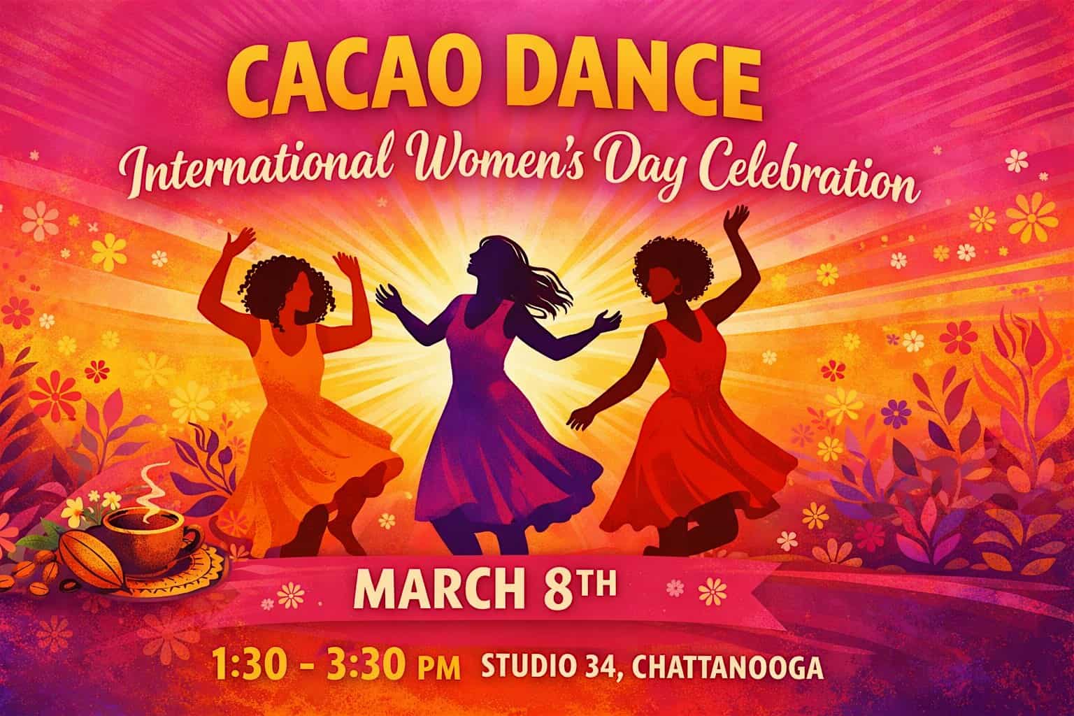 by admin23Feb Cacao Dance: International Women’s Day Celebration at Studio34 – Chattanooga, TN Cacao Dance: International Women’s Day Celebration at Studio34 – Chattanooga, TN 1 1 people viewed this event. Women-only freestyle dance that is fueled by a heart-opening cacao ceremony – perfect for any woman who is celebrating her nature and life. Tickets-RSVP Link Date And Time Sunday, March 8th, 2026 @ 01:00 PM Location 3214 Brainerd Road, Chattanooga, TN 37411 Event Types Community & CultureParty or Social Gathering Event Category ChattanoogaTennessee Share With Friends Facebook Twitter Linkedin Xing Pinterest Share This Post: