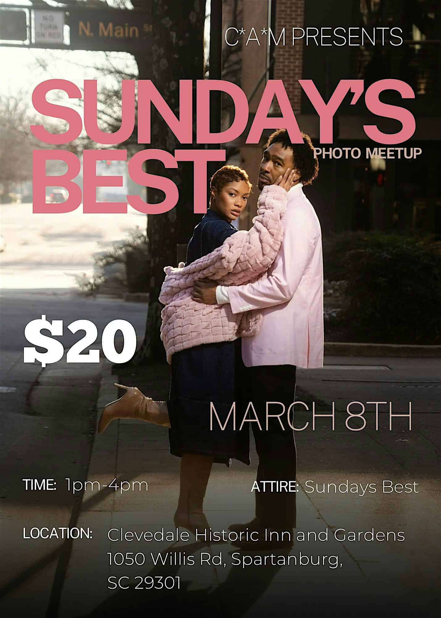 by admin23Feb C*A*M presents Sundays Best at Clevedale Historic Inn and Gardens – Spartanburg, SC C*A*M presents Sundays Best at Clevedale Historic Inn and Gardens – Spartanburg, SC 1 1 people viewed this event. A creative gathering for models, photographers, and videographers to connect, collaborate, and create. Tickets-RSVP Link Date And Time Sunday, March 8th, 2026 @ 01:00 PM Location 1050 Willis Road, Spartanburg, SC 29301 Event Types Fashion & BeautyParty or Social Gathering Event Category South Carolina Share With Friends Facebook Twitter Linkedin Xing Pinterest Share This Post: