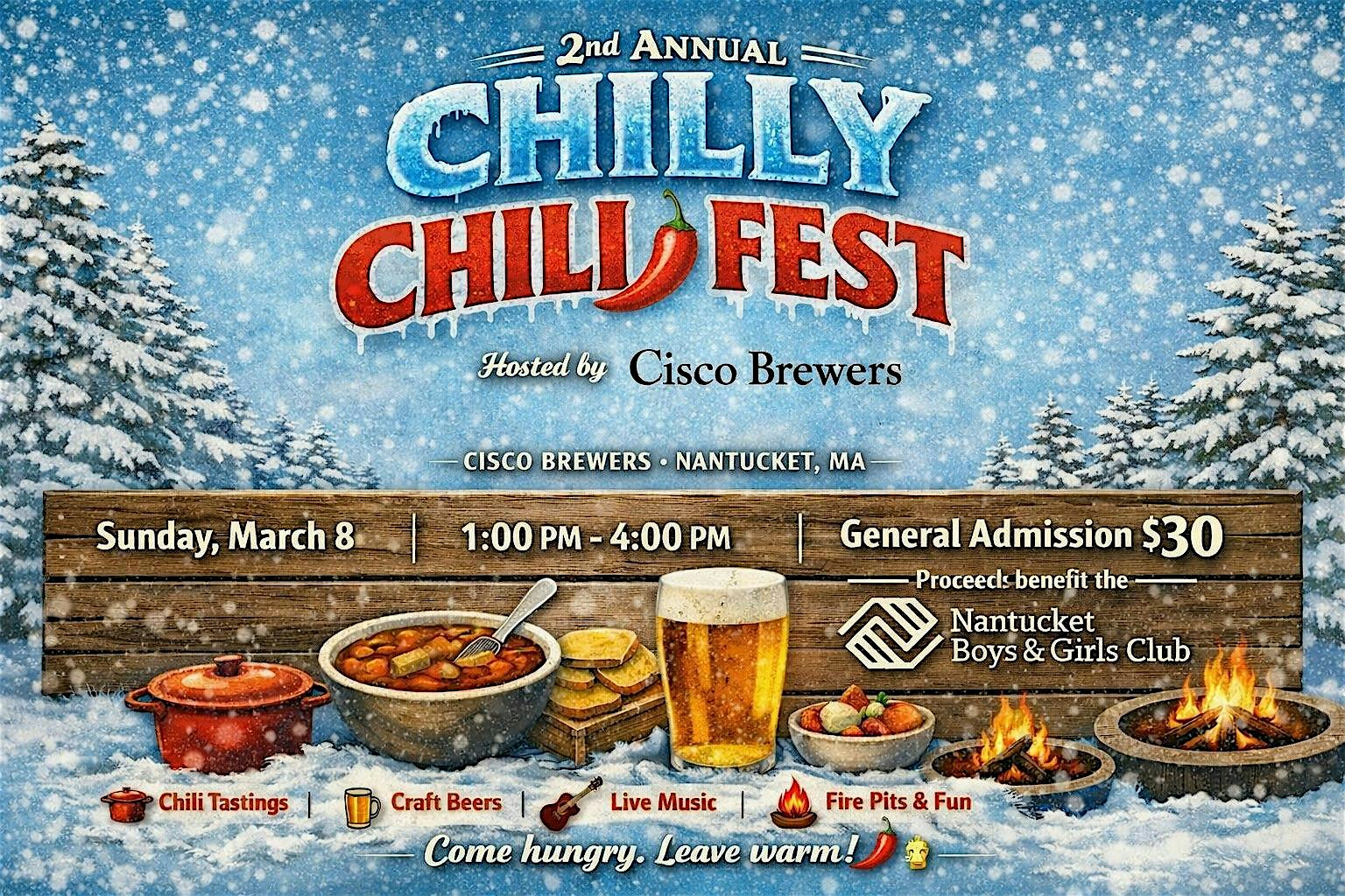 by admin27Feb Cisco Brewers Chilly Chili Fest at Cisco Brewers – Nantucket, MA Cisco Brewers Chilly Chili Fest at Cisco Brewers – Nantucket, MA 1 1 people viewed this event. Come warm up and chow down at the 2nd Annual Cisco Brewers Chilly Chili Fest to benefit the Nantucket Boys and Girls Club. Tickets-RSVP Link Date And Time Sunday, March 8th, 2026 01:00 PM (PST) Venue Cisco Brewers Location 5 Bartlett Farm Road, Nantucket, MA 2554 Event Types Festival or FairFood & Drink Event Category Massachusetts Share With Friends Facebook Twitter Linkedin Xing Pinterest Share This Post: