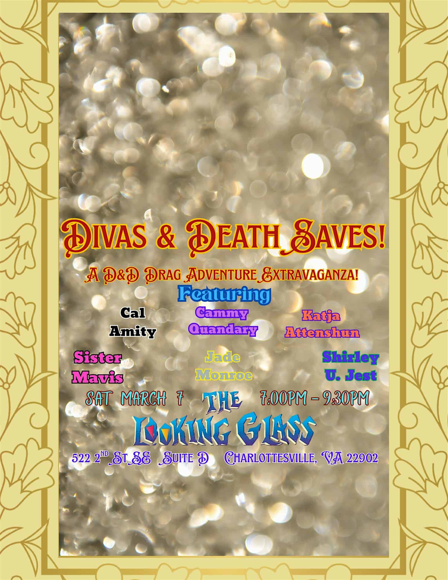 by admin14Feb Divas & Death Saves at The Looking Glass Immersive Art Experience – Charlottesville, VA Divas & Death Saves at The Looking Glass Immersive Art Experience – Charlottesville, VA 2 2 people viewed this event. “Divas & Death Saves” is a Live Play Drag D&D show blending the structure of a traditional drag show with the thrill of High Fantasy Action! Tickets-RSVP Link Date And Time Sunday, March 8th, 2026 12:00 AM (PST) Venue The Looking Glass Immersive Art Experience Location 522 2nd Street Southeast, Charlottesville, VA 22902 Event Types Concert or PerformancePerforming & Visual Arts Event Category Virginia Share With Friends Facebook Twitter Linkedin Xing Pinterest Share This Post: