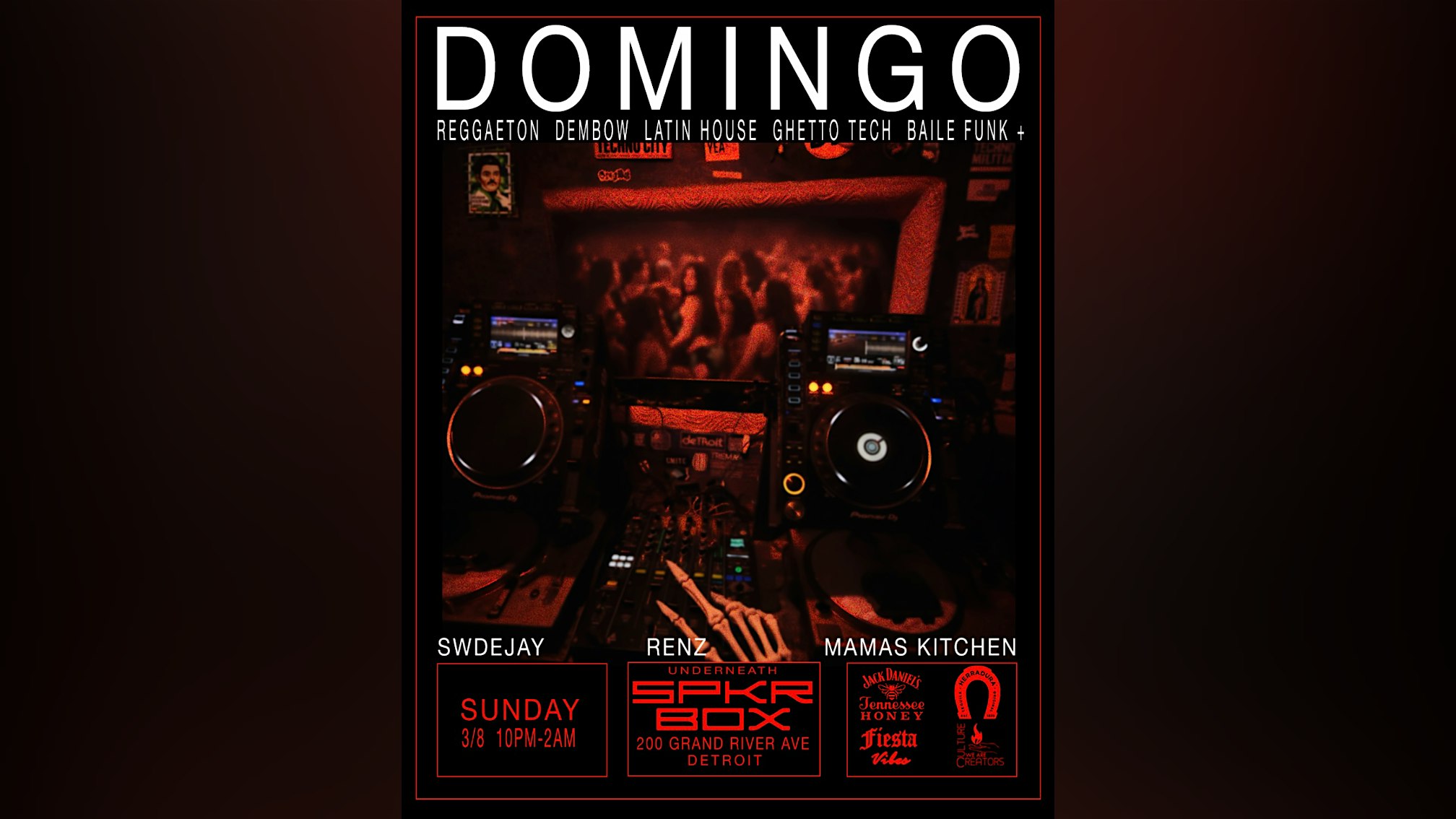 by admin05Mar DOMINGO at SPKRBOX – Detroit, MI DOMINGO at SPKRBOX – Detroit, MI 2 2 people viewed this event. DOMINGO Downtown’s favorite Sunday escape. Reggaeton, dembow, Latin house & ghetto tech + late night tacos SWDEJAY & Renz 10PM–2AM Tickets-RSVP Link Date And Time Sunday, March 8th, 2026 10:00 PM (PST) Venue SPKRBOX Location 200 Grand River Avenue, Detroit, MI 48226 Event Types MusicParty or Social Gathering Event Category DetroitMichigan Share With Friends Facebook Twitter Linkedin Xing Pinterest Share This Post: