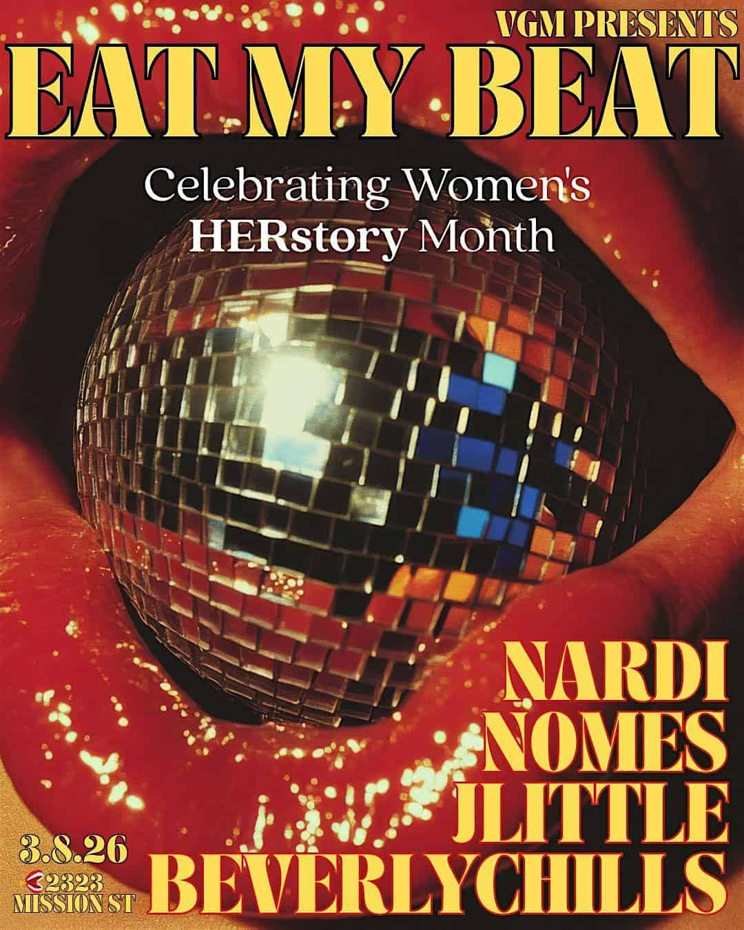 by admin14Feb EAT MY BEAT at Teeth Bar SF – San Francisco, CA EAT MY BEAT at Teeth Bar SF – San Francisco, CA 2 2 people viewed this event. Sunday March 8th, 2-8PM – NARDI,NOMES, JLITTLE, BEVCHILLS, FORMERLY KNOWN AS BEATS & EATS JOIN US FOR OUR 1 YEAR ANNIVERSARY PARTY @ TEETH Tickets-RSVP Link Date And Time Sunday, March 8th, 2026 09:00 PM (PST) Venue Teeth Bar SF Location 2323 Mission Street, San Francisco, CA 94110 Event Types Concert or PerformanceFood & Drink Event Category CaliforniaSan Francisco Share With Friends Facebook Twitter Linkedin Xing Pinterest Share This Post: