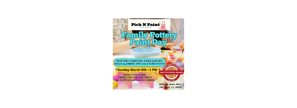 by admin23Feb Family Pottery Paint Day at Patty’s Pizza Shack – Elk Grove, CA Family Pottery Paint Day at Patty’s Pizza Shack – Elk Grove, CA 4 4 people viewed this event. Paint. Pizza. Family Fun! Join us for a hands on afternoon of pottery painting for all ages and skill! Food and drink specials. Tickets-RSVP Link Date And Time Sunday, March 8th, 2026 01:00 PM (PST) Venue Patty's Pizza Shack Location 8591 Elk Grove Boulevard, Elk Grove, CA 95624 Event Types Food & Drink Event Category CaliforniaSacramento Share With Friends Facebook Twitter Linkedin Xing Pinterest Share This Post: