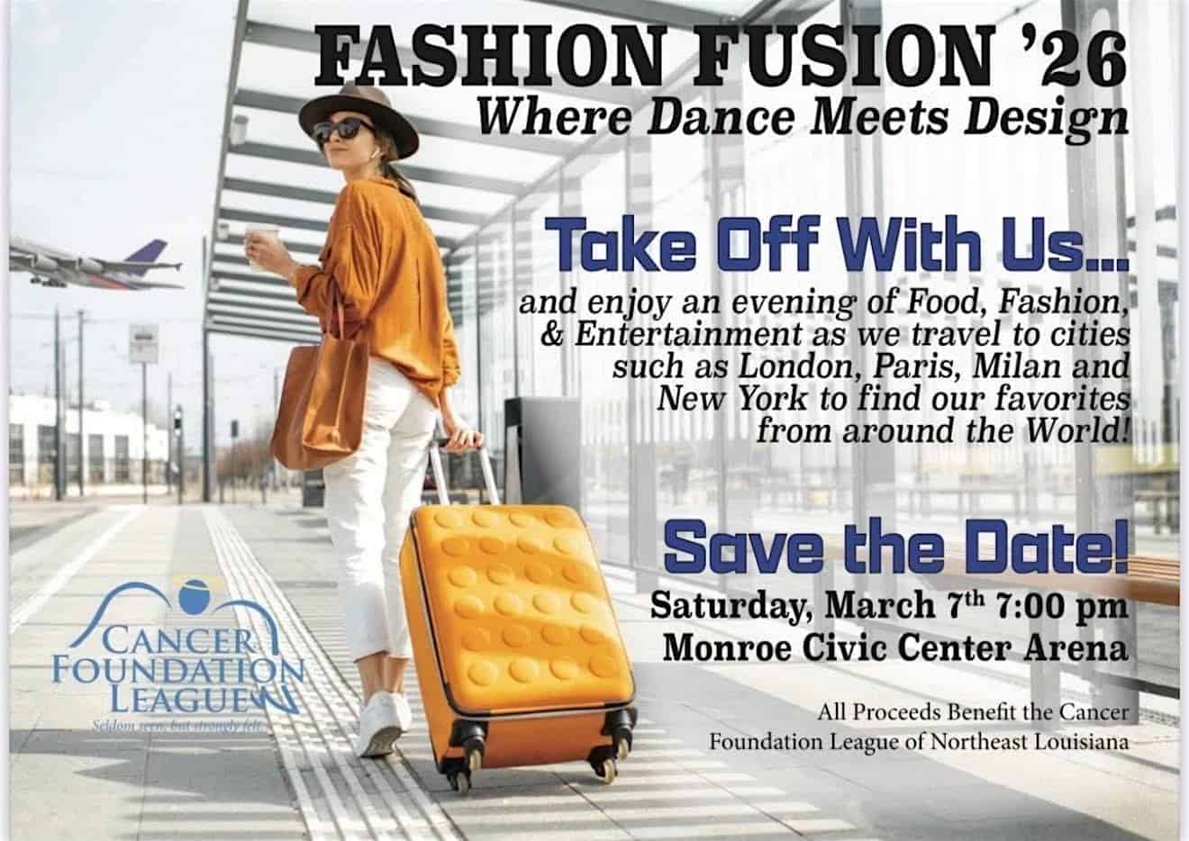 by admin14Feb FASHION FUSION 2026 – “Where Dance Meets Design” at Monroe Civic Center – Monroe, LA FASHION FUSION 2026 – “Where Dance Meets Design” at Monroe Civic Center – Monroe, LA 3 3 people viewed this event. Join us for an evening of Fashion, Hors ‘d’oeuvres & Entertainment benefiting the Cancer Foundation League! – Doors Open @ 5:45 PM Tickets-RSVP Link Date And Time Sunday, March 8th, 2026 01:00 AM (PST) Venue Monroe Civic Center Location 401 Lea Joyner Memorial Expressway, Monroe, LA 71201 Event Types Concert or PerformanceFashion & Beauty Event Category Louisiana Share With Friends Facebook Twitter Linkedin Xing Pinterest Share This Post: