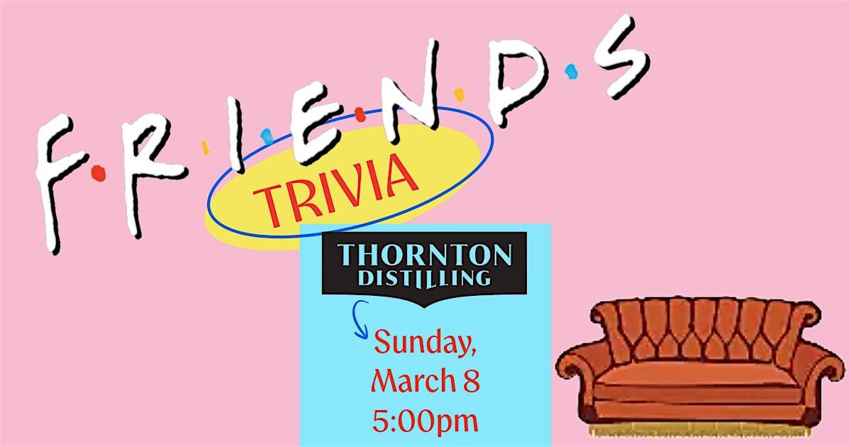 by admin14Feb Friends Trivia at Thornton Distilling Co. at Thornton Distilling Co. – Thornton, IL Friends Trivia at Thornton Distilling Co. at Thornton Distilling Co. – Thornton, IL 2 2 people viewed this event. Tickets include reserved seating, door prizes/souvenirs for every team, and the chance to win one of three ‘Friends’-themed prize packs! Tickets-RSVP Link Date And Time Sunday, March 8th, 2026 10:00 PM (PST) Venue Thornton Distilling Co. Location 400 East Margaret Street, Thornton, IL 60476 Event Types Food & Drink Event Category Illinois Share With Friends Facebook Twitter Linkedin Xing Pinterest Share This Post: