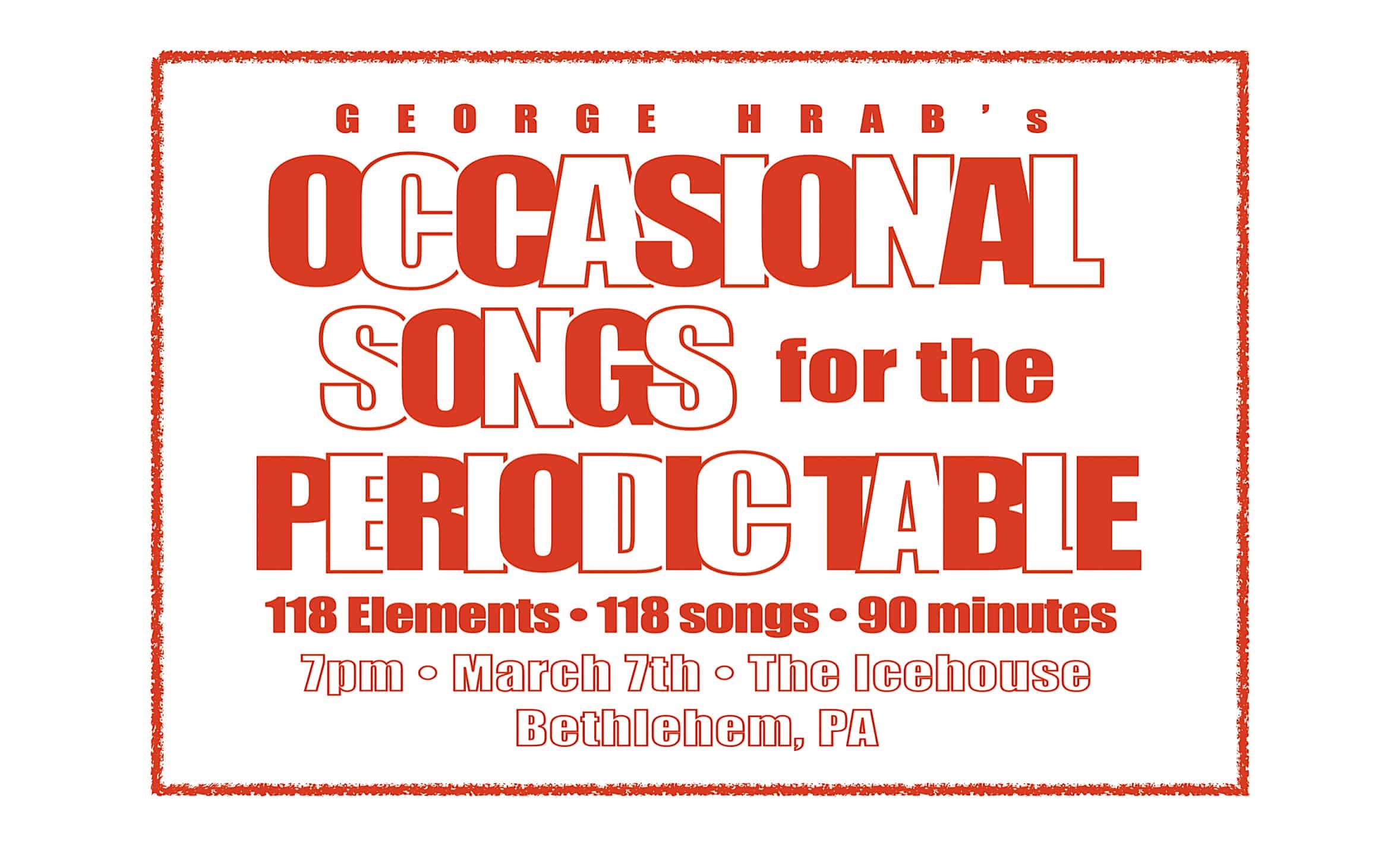 by admin14Feb George Hrab’s Occasional Songs for the Periodic Table at The Ice House – Bethlehem, PA George Hrab’s Occasional Songs for the Periodic Table at The Ice House – Bethlehem, PA 2 2 people viewed this event. A concert featuring one song for each element of the periodic table.118 Elements, 118 songs, in 90 minutes. Performed by the George HraBand! Tickets-RSVP Link Date And Time Sunday, March 8th, 2026 12:00 AM (PST) Venue The Ice House Location 56 River Street, Bethlehem, PA 18018 Event Types Concert or Performance Event Category Pennsylvania Share With Friends Facebook Twitter Linkedin Xing Pinterest Share This Post: