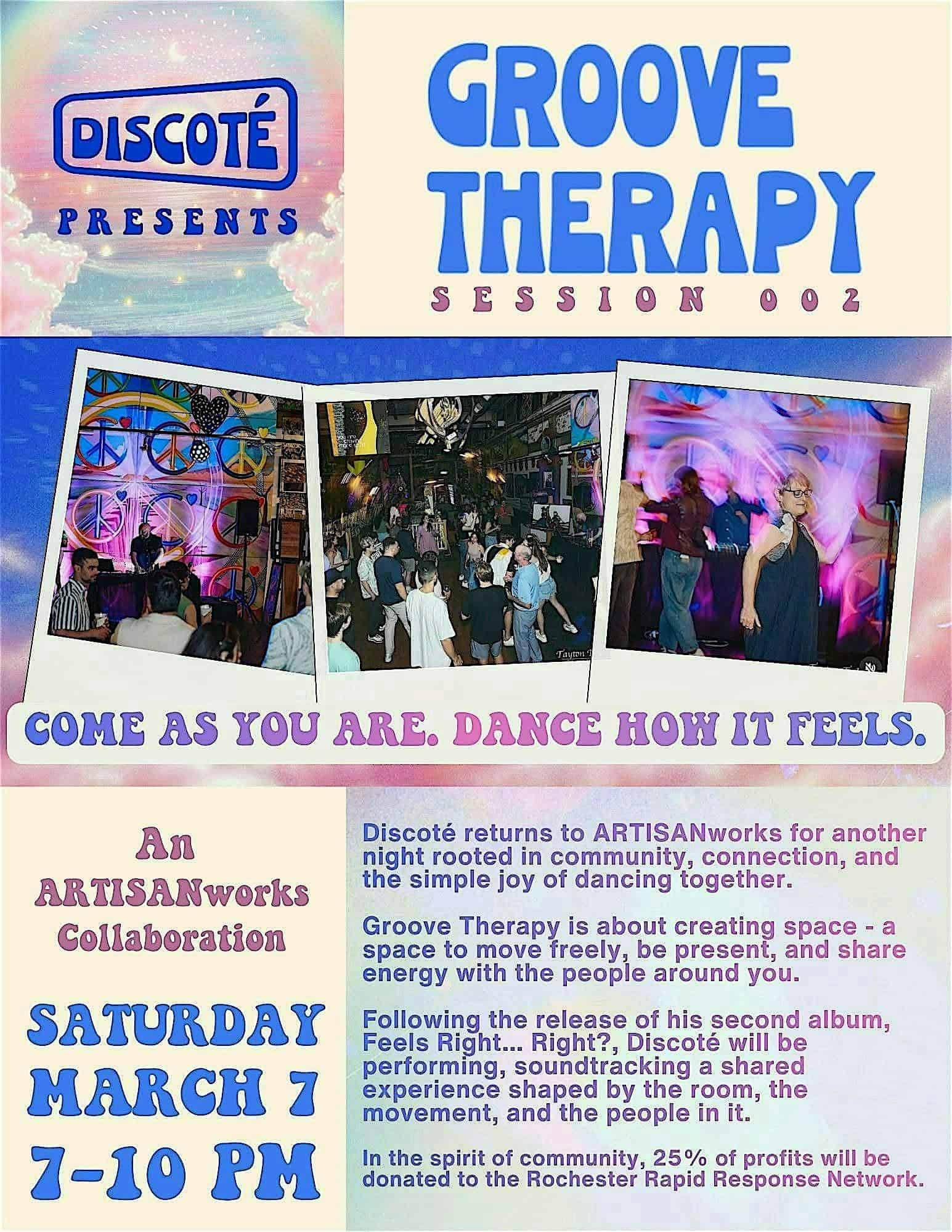 by admin14Feb Groove Therapy – Session 002. An ARTISANworks collaboration! at ARTISANworks – Rochester, NY Groove Therapy – Session 002. An ARTISANworks collaboration! at ARTISANworks – Rochester, NY 1 1 people viewed this event. Groove Therapy returns to ARTISANworks — a night to dance, connect, and enjoy music by Discoté and shared energy. Tickets-RSVP Link Date And Time Sunday, March 8th, 2026 12:00 AM (PST) Venue ARTISANworks Location 565 Blossom Road, Rochester, NY 14610 Event Types Concert or PerformancePerforming & Visual Arts Event Category New York Share With Friends Facebook Twitter Linkedin Xing Pinterest Share This Post: