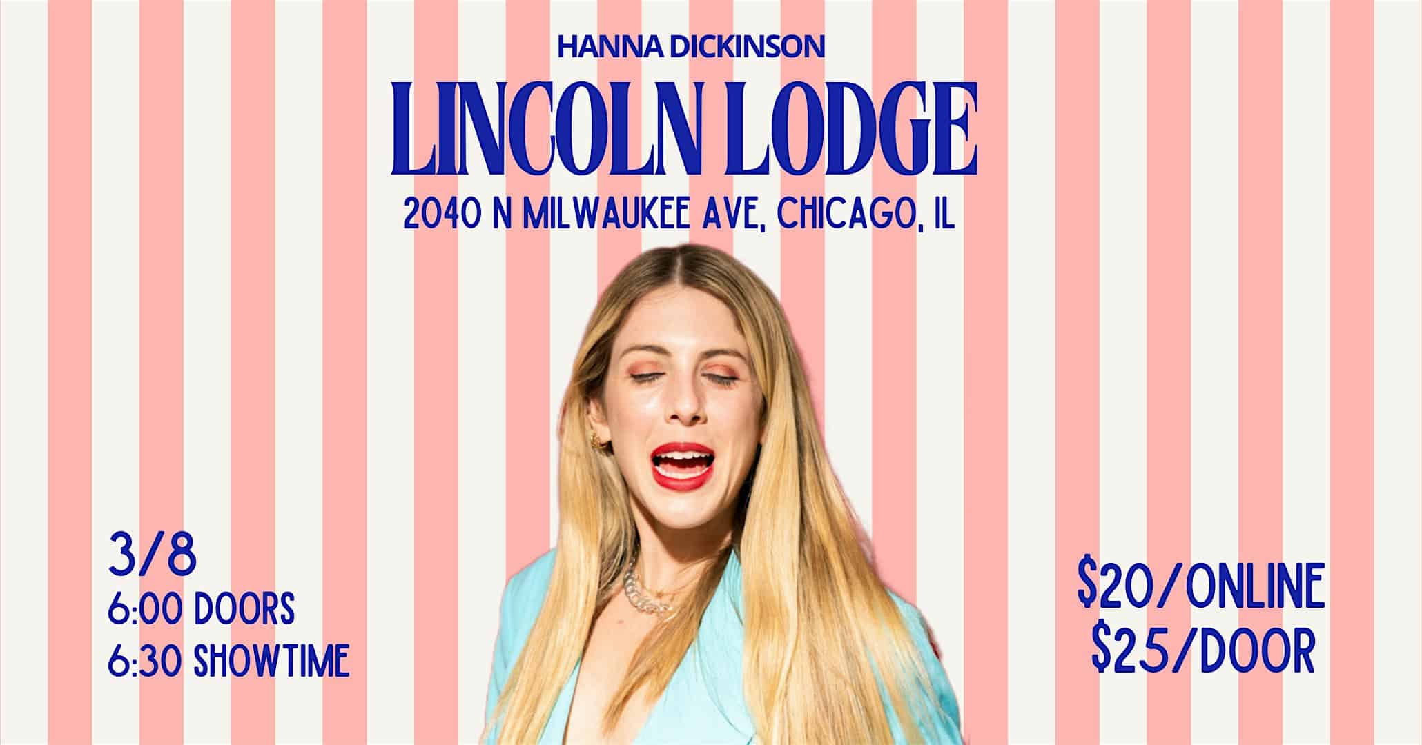 by admin14Feb Hanna Dickinson Live in Chicago! at The Lincoln Lodge – Chicago, IL Hanna Dickinson Live in Chicago! at The Lincoln Lodge – Chicago, IL 2 2 people viewed this event. Hanna runs her hour of stand-up Tickets-RSVP Link Date And Time Sunday, March 8th, 2026 11:00 PM (PST) Venue The Lincoln Lodge Location 2040 North Milwaukee Avenue, Chicago, IL 60647 Event Types Concert or PerformanceFilm, Media & Entertainment Event Category ChicagoIllinois Share With Friends Facebook Twitter Linkedin Xing Pinterest Share This Post: