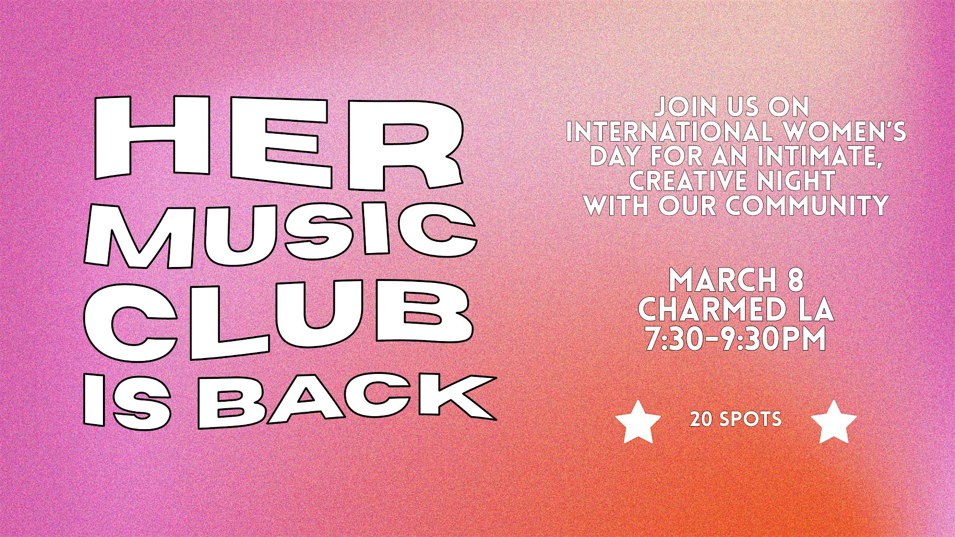 by admin27Feb Her Music Club x International Women’s Day at Charmed LA – Los Angeles, CA Her Music Club x International Women’s Day at Charmed LA – Los Angeles, CA 1 1 people viewed this event. After a hiatus, we’re back! Join us on International Women’s Day for an intimate, creative night at Charmed LA. Tickets-RSVP Link Date And Time Sunday, March 8th, 2026 07:00 PM (PST) Venue Charmed LA Location 7967 Melrose Avenue, Los Angeles, CA 90046 Event Types Music Event Category CaliforniaLos Angeles Share With Friends Facebook Twitter Linkedin Xing Pinterest Share This Post:
