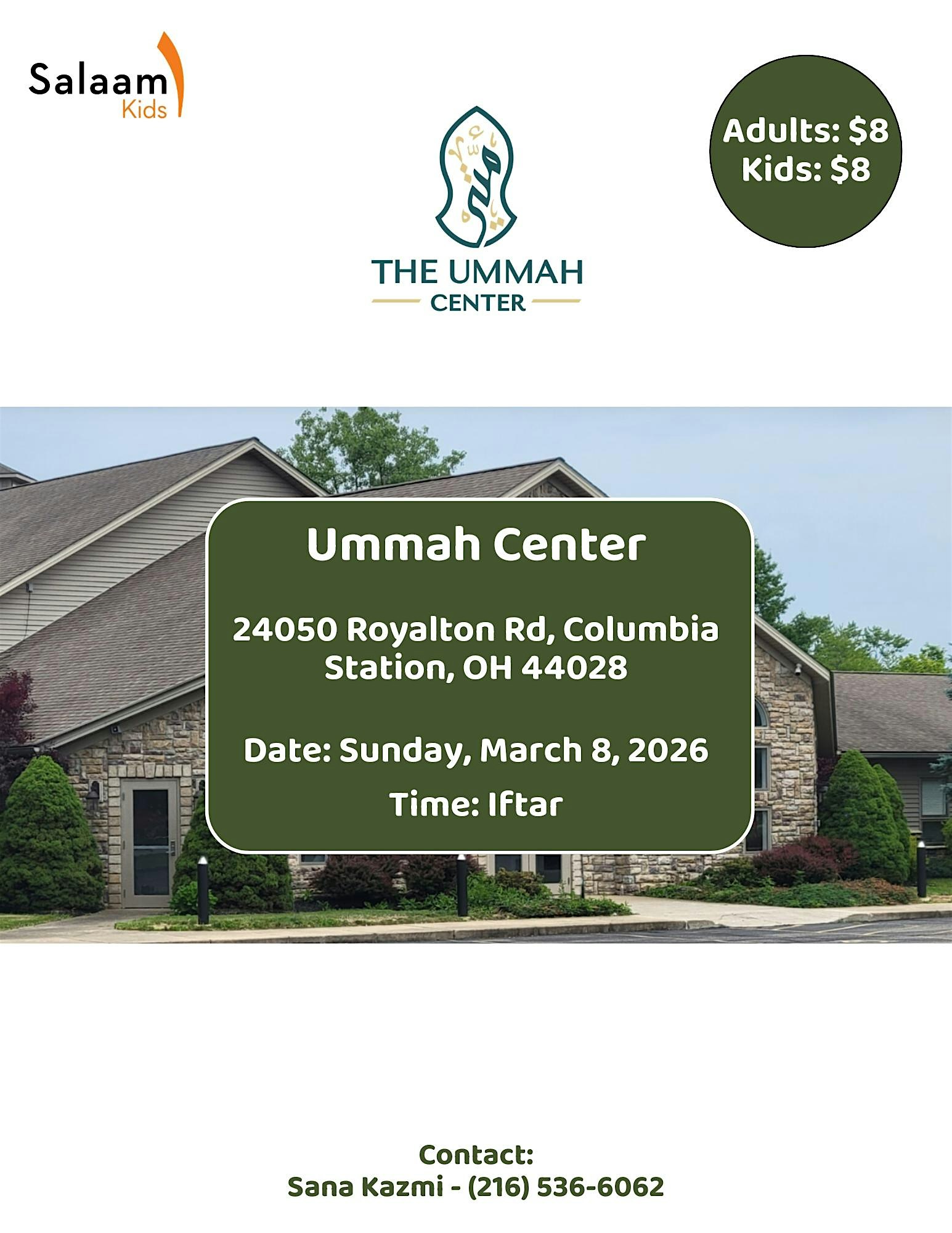 by admin27Feb Iftar Dinner at The Ummah Center – Columbia Station, OH Iftar Dinner at The Ummah Center – Columbia Station, OH 1 1 people viewed this event. Come and enjoy Iftar dinner with Salaam Kids Family. I will provide arts and craft for the kids and Iftar for the families. Please join us Tickets-RSVP Link Date And Time Sunday, March 8th, 2026 06:00 PM (PST) Venue The Ummah Center Location 24050 Royalton Road, Columbia Station, OH 44028 Event Types Food & Drink Event Category Ohio Share With Friends Facebook Twitter Linkedin Xing Pinterest Share This Post: