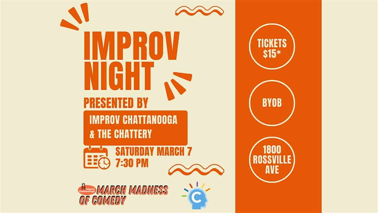 by admin14Feb Improv Comedy Show at The Chattery at The Chattery – Chattanooga, TN Improv Comedy Show at The Chattery at The Chattery – Chattanooga, TN 2 2 people viewed this event. Join us for a night of hilarious improv comedy at The Chattery, presented by Improv Chattanooga! Tickets-RSVP Link Date And Time Sunday, March 8th, 2026 12:00 AM (PST) Venue The Chattery Location 1800 Rossville Avenue, Chattanooga, TN 37408 Event Types Concert or PerformancePerforming & Visual Arts Event Category ChattanoogaTennessee Share With Friends Facebook Twitter Linkedin Xing Pinterest Share This Post: