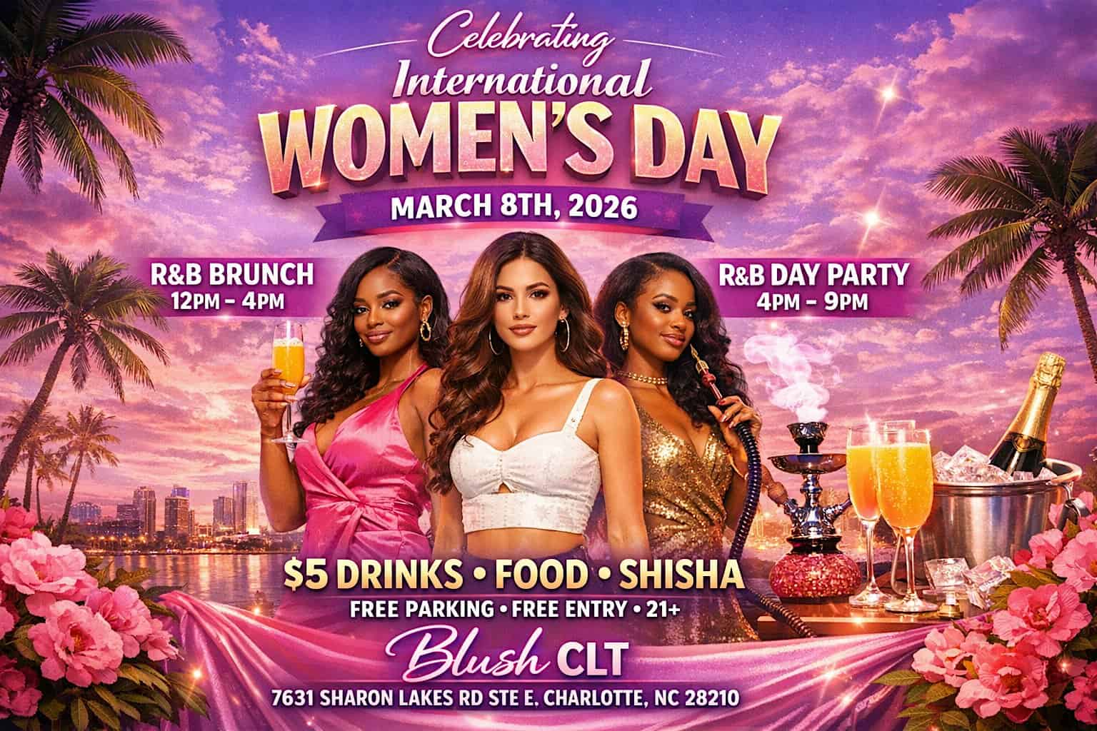 by admin23Feb Int’l Womens Day: R&B Brunch & Day Party at Blush CLT – Charlotte, NC Int’l Womens Day: R&B Brunch & Day Party at Blush CLT – Charlotte, NC 4 4 people viewed this event. Celebrate fierce women with vibes, beats, and brunch at the Int’l Womens Day R&B Day Party! Tickets-RSVP Link Date And Time Sunday, March 8th, 2026 @ 12:00 PM Location 7631 Sharon Lakes Road, Charlotte, NC 28210 Event Types MusicParty or Social Gathering Event Category CharlotteNorth Carolina Share With Friends Facebook Twitter Linkedin Xing Pinterest Share This Post: