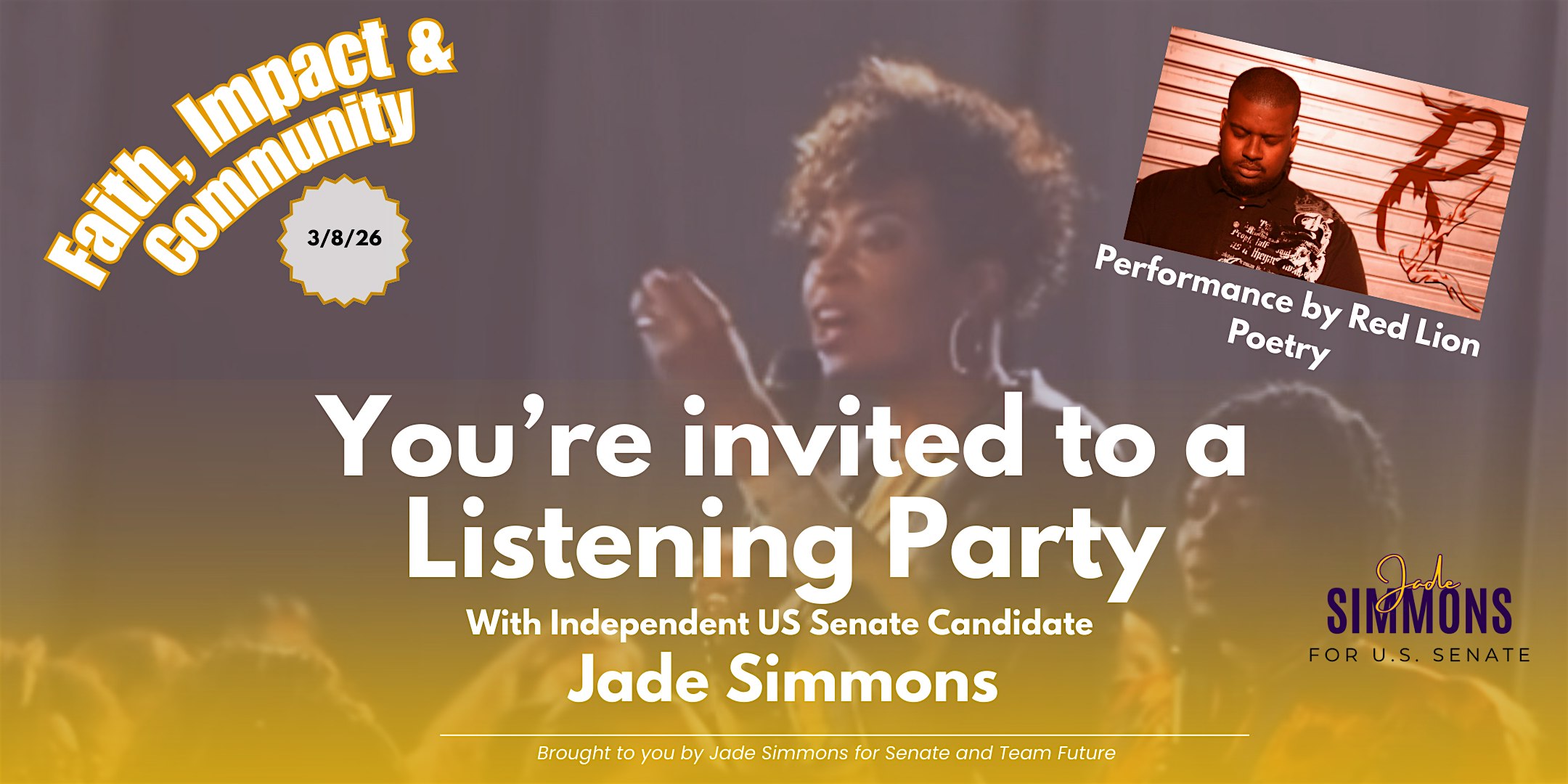 by admin27Feb Jade Simmons for Senate Listening Party: Faith, Impact, & Community at Ninety9 Cafe – Humble, TX Jade Simmons for Senate Listening Party: Faith, Impact, & Community at Ninety9 Cafe – Humble, TX 1 1 people viewed this event. Join Jade & Red Lion Poetry in person for a special Listening Party to connect around the power and potential of faith on our communities. Tickets-RSVP Link Date And Time Sunday, March 8th, 2026 @ 04:00 PM Location 14814 Ralston Road, Humble, TX 77396 Event Types Community & CultureParty or Social Gathering Event Category HoustonTexas Share With Friends Facebook Twitter Linkedin Xing Pinterest Share This Post: