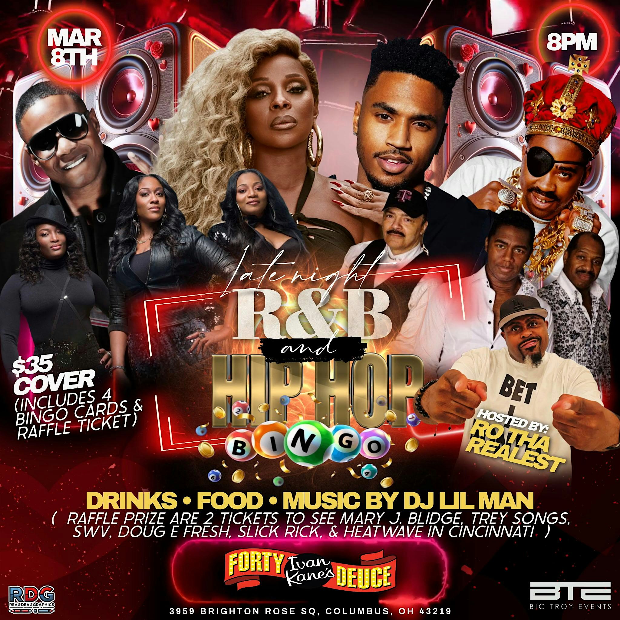 by admin13Feb LATE R&B Bingo! Win tix for Mary J Blige, Trey Songz, SWV & More at Forty Deuce Burlesque & Speakeasy – Columbus, OH LATE R&B Bingo! Win tix for Mary J Blige, Trey Songz, SWV & More at Forty Deuce Burlesque & Speakeasy – Columbus, OH 1 1 people viewed this event. PLAY BINGO WHILE LISTENING TO A MIX OF R&B FROM FEATURED ARTISTS SUNDAY, MARCH 8th 2026 @ 7PM IN THE FORTY DEUCE EASTON SPEAKEASY! Tickets-RSVP Link Date And Time Sunday, March 8th, 2026 11:00 PM (PST) Venue Forty Deuce Burlesque & Speakeasy Location 3959 Brighton Rose Square, Columbus, OH 43219 Event Types Concert or PerformanceMusic Event Category Ohio Share With Friends Facebook Twitter Linkedin Xing Pinterest Share This Post: