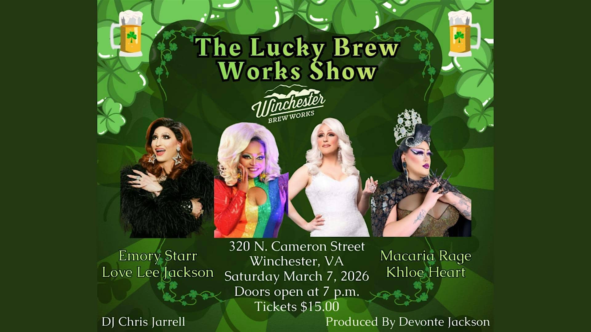by admin14Feb Lucky Brew Drag Show! at Winchester Brew Works – Winchester, VA Lucky Brew Drag Show! at Winchester Brew Works – Winchester, VA 3 3 people viewed this event. This is one of our favorite events of the year! Are you feeling lucky? Join us for another amazing Drag Show hosted by Devonte Jackson! Tickets-RSVP Link Date And Time Sunday, March 8th, 2026 01:00 AM (PST) Venue Winchester Brew Works Location 320 North Cameron Street, Winchester, VA 22601 Event Types Concert or PerformancePerforming & Visual Arts Event Category Virginia Share With Friends Facebook Twitter Linkedin Xing Pinterest Share This Post: