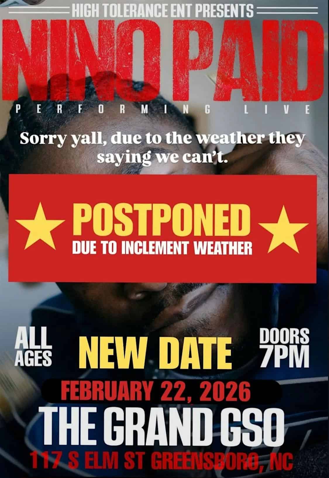 by admin23Feb Nino Paid x YoJwill & FFreejuan (New Date) at THE GRAND GSO – Greensboro, NC Nino Paid x YoJwill & FFreejuan (New Date) at THE GRAND GSO – Greensboro, NC 2 2 people viewed this event. Get ready to vibe live with Nino Paid, YoJwill, and FFreejuan in one epic in-person event! Tickets-RSVP Link Date And Time Sunday, March 8th, 2026 07:00 PM (PST) Venue THE GRAND GSO Location 117 South Elm Street, Greensboro, NC 27401 Event Types Concert or PerformanceMusic Event Category GreensboroNorth Carolina Share With Friends Facebook Twitter Linkedin Xing Pinterest Share This Post:
