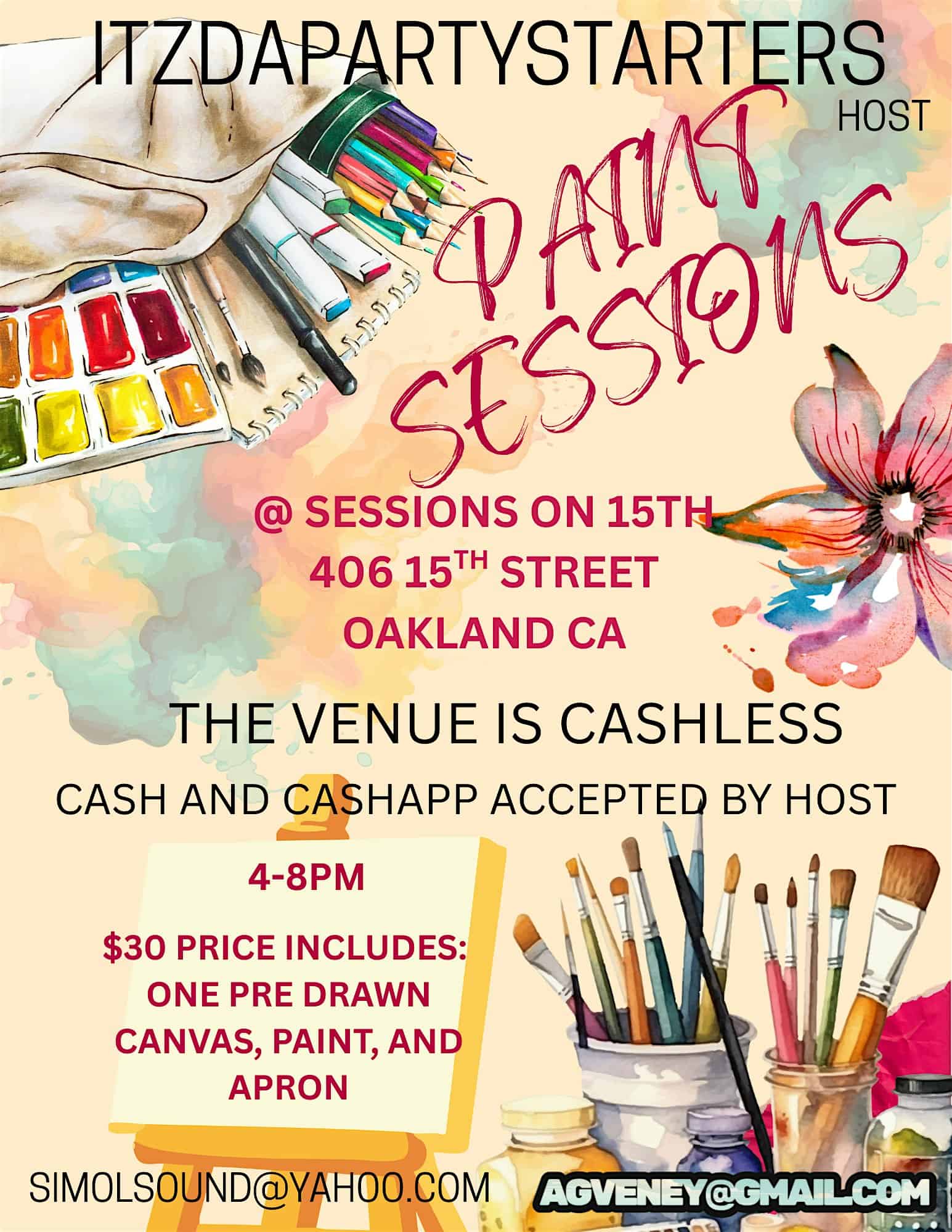 by admin14Feb PAINT SESSIONS at Sessions on 15th – Oakland, CA PAINT SESSIONS at Sessions on 15th – Oakland, CA 1 1 people viewed this event. Experience the perfect Sunday Funday where you can relax and enjoy a creative paint session at the favorite neighborhood hang out spot Tickets-RSVP Link Date And Time Sunday, March 8th, 2026 11:00 PM (PST) Venue Sessions on 15th Location 406 15th Street, Oakland, CA 94612 Event Types Party or Social Gathering Event Category CaliforniaOakland Share With Friends Facebook Twitter Linkedin Xing Pinterest Share This Post: