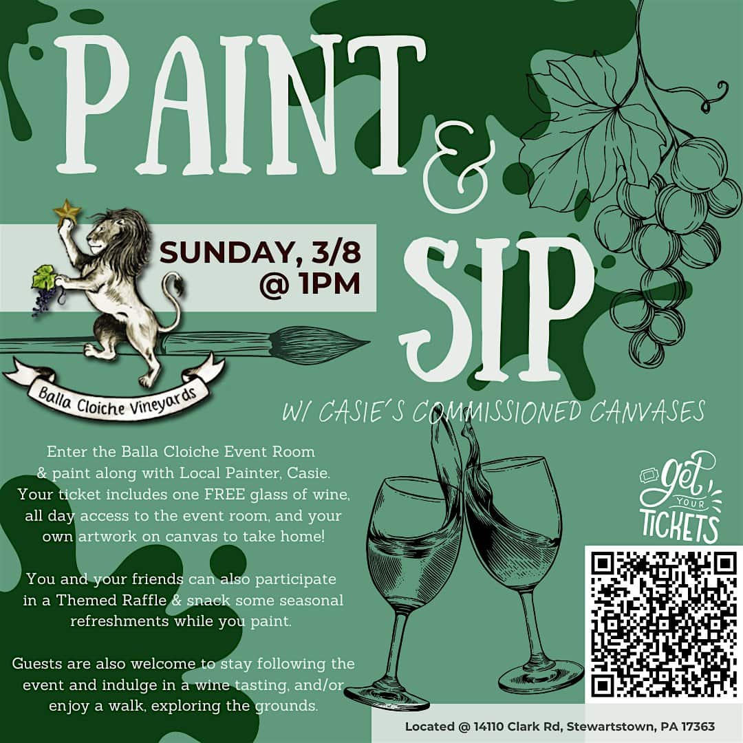 by admin14Feb Paint & Sip @ Balla Cloiche Vineyards at Balla Cloiche Vineyards – Stewartstown, PA Paint & Sip @ Balla Cloiche Vineyards at Balla Cloiche Vineyards – Stewartstown, PA 1 1 people viewed this event. Join Casie’s Commissioned Canvases @ Balla Cloiche Vineyards for our next Paint & Sip Sunday~ Tickets-RSVP Link Date And Time Sunday, March 8th, 2026 05:00 PM (PST) Venue Balla Cloiche Vineyards Location 14110 Clark Road, Stewartstown, PA 17363 Event Types Food & Drink Event Category Pennsylvania Share With Friends Facebook Twitter Linkedin Xing Pinterest Share This Post: