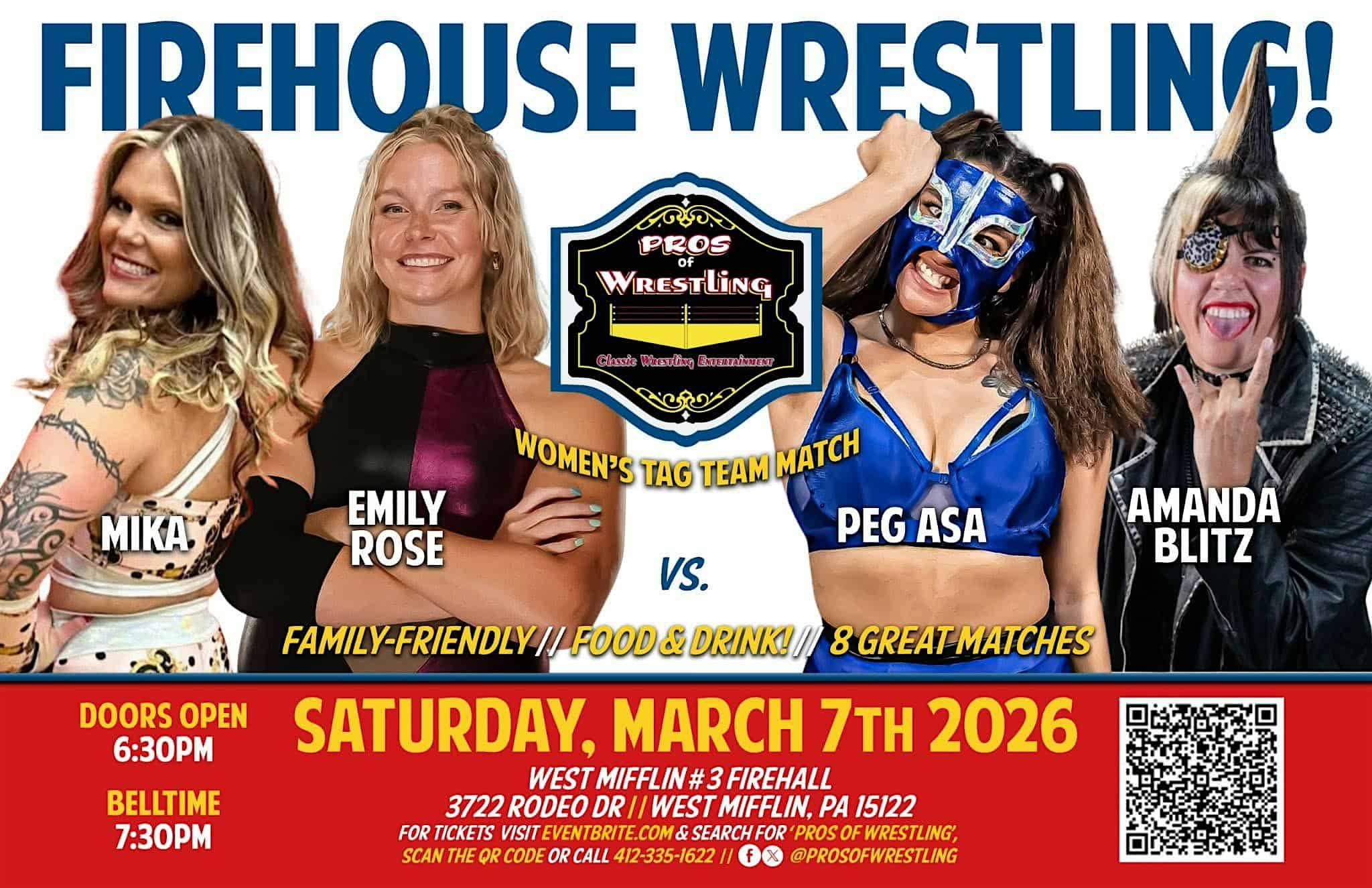 by admin14Feb Pros of Wrestling Presents: FIREHOUSE WRESTLING! at West Mifflin #3 Volunteer Fire Company – West Mifflin, PA Pros of Wrestling Presents: FIREHOUSE WRESTLING! at West Mifflin #3 Volunteer Fire Company – West Mifflin, PA 2 2 people viewed this event. Pros of Wrestling is coming to West Mifflin PA! Join us for an action packed evening, fun for the entire family. Tickets-RSVP Link Date And Time Sunday, March 8th, 2026 12:00 AM (PST) Venue West Mifflin #3 Volunteer Fire Company Location 3722 Rodeo Drive, West Mifflin, PA 15122 Event Types Concert or PerformanceSports & Fitness Event Category Pennsylvania Share With Friends Facebook Twitter Linkedin Xing Pinterest Share This Post: