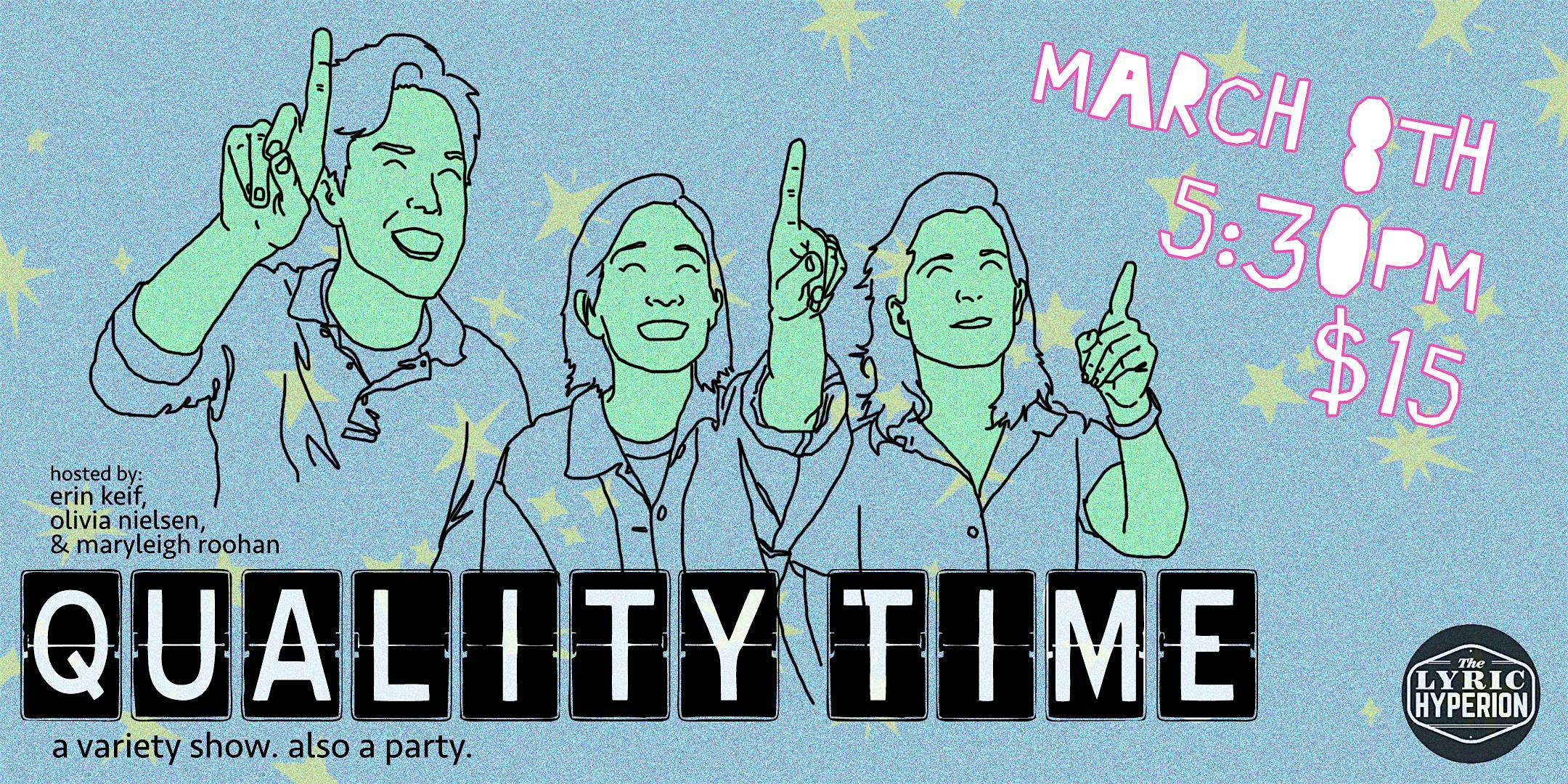 by admin05Mar Quality Time at Lyric Hyperion Theater & Bar – Los Angeles, CA Quality Time at Lyric Hyperion Theater & Bar – Los Angeles, CA 1 1 people viewed this event. Quality Time is a variety show hosted by Erin Keif, Olivia Nielsen, & MaryLeigh Roohan. It’s a show. It’s a party. Make a pal. Have a crush. Tickets-RSVP Link Date And Time Sunday, March 8th, 2026 05:00 PM (PST) Venue Lyric Hyperion Theater & Bar Location 2106 Hyperion Avenue, Los Angeles, CA 90027 Event Types Concert or PerformancePerforming & Visual Arts Event Category CaliforniaLos Angeles Share With Friends Facebook Twitter Linkedin Xing Pinterest Share This Post: