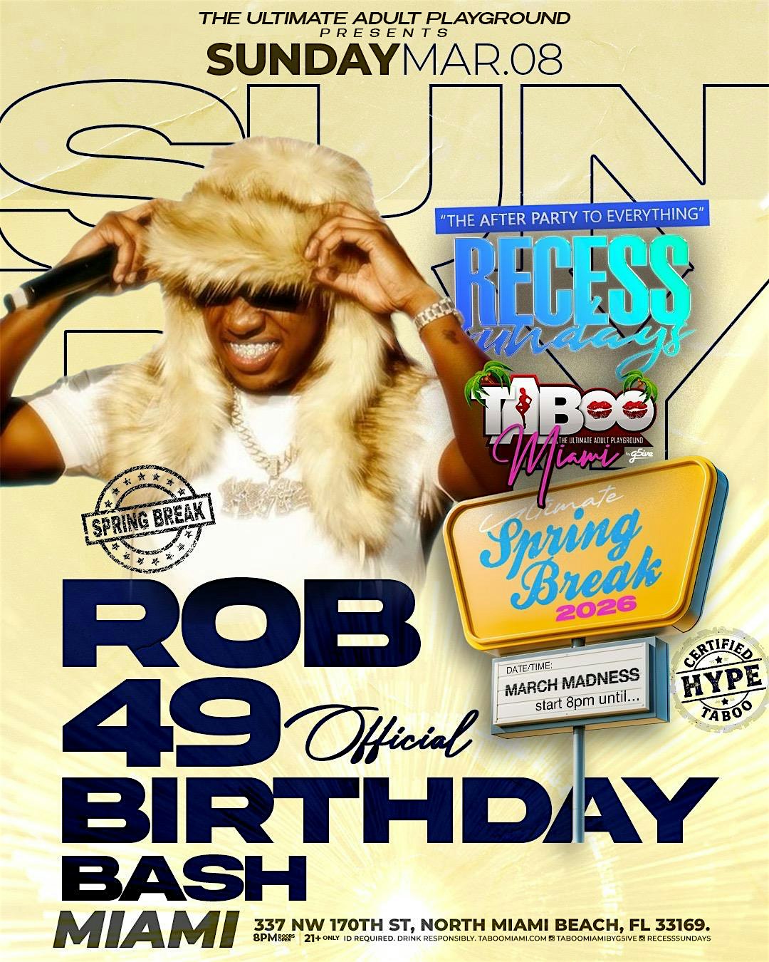 by admin05Mar Recess Sundays: The Ultimate Adult Playground (Rob 49 Birthday Bash) at Taboo Miami by G5ive – North Miami Beach, FL Recess Sundays: The Ultimate Adult Playground (Rob 49 Birthday Bash) at Taboo Miami by G5ive – North Miami Beach, FL 2 2 people viewed this event. The Ultimate Adult Playground presents Recess Sundays: Where The Stars Come To Play! • “The Afterparty To Everything” Tickets-RSVP Link Date And Time Sunday, March 8th, 2026 08:00 PM (PST) Venue Taboo Miami by G5ive Location 337 Northwest 170th Street, North Miami Beach, FL 33169 Event Types MusicParty or Social Gathering Event Category FloridaMiami Share With Friends Facebook Twitter Linkedin Xing Pinterest Share This Post: