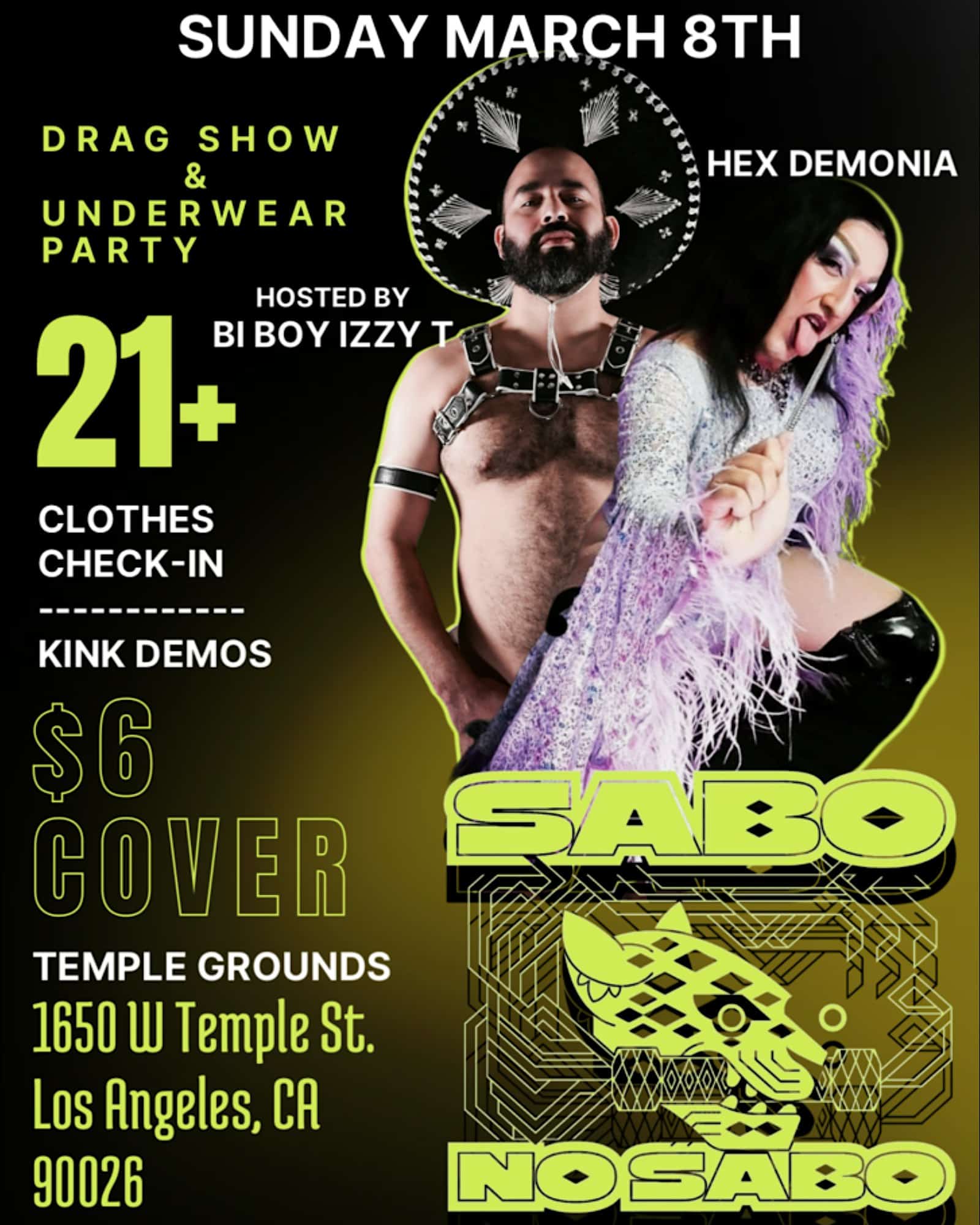 by admin14Feb SABO NO SABO at Temple Grounds – Los Angeles, CA SABO NO SABO at Temple Grounds – Los Angeles, CA 2 2 people viewed this event. A Queer Sunday Funday Drag Show and Underwear party with all your favorite party jamz. The afternoon includes Go Go dancers and kink demos! Tickets-RSVP Link Date And Time Sunday, March 8th, 2026 09:00 PM (PST) Venue Temple Grounds Location 1650 West Temple Street, Los Angeles, CA 90026 Event Types OtherParty or Social Gathering Event Category CaliforniaLos Angeles Share With Friends Facebook Twitter Linkedin Xing Pinterest Share This Post: