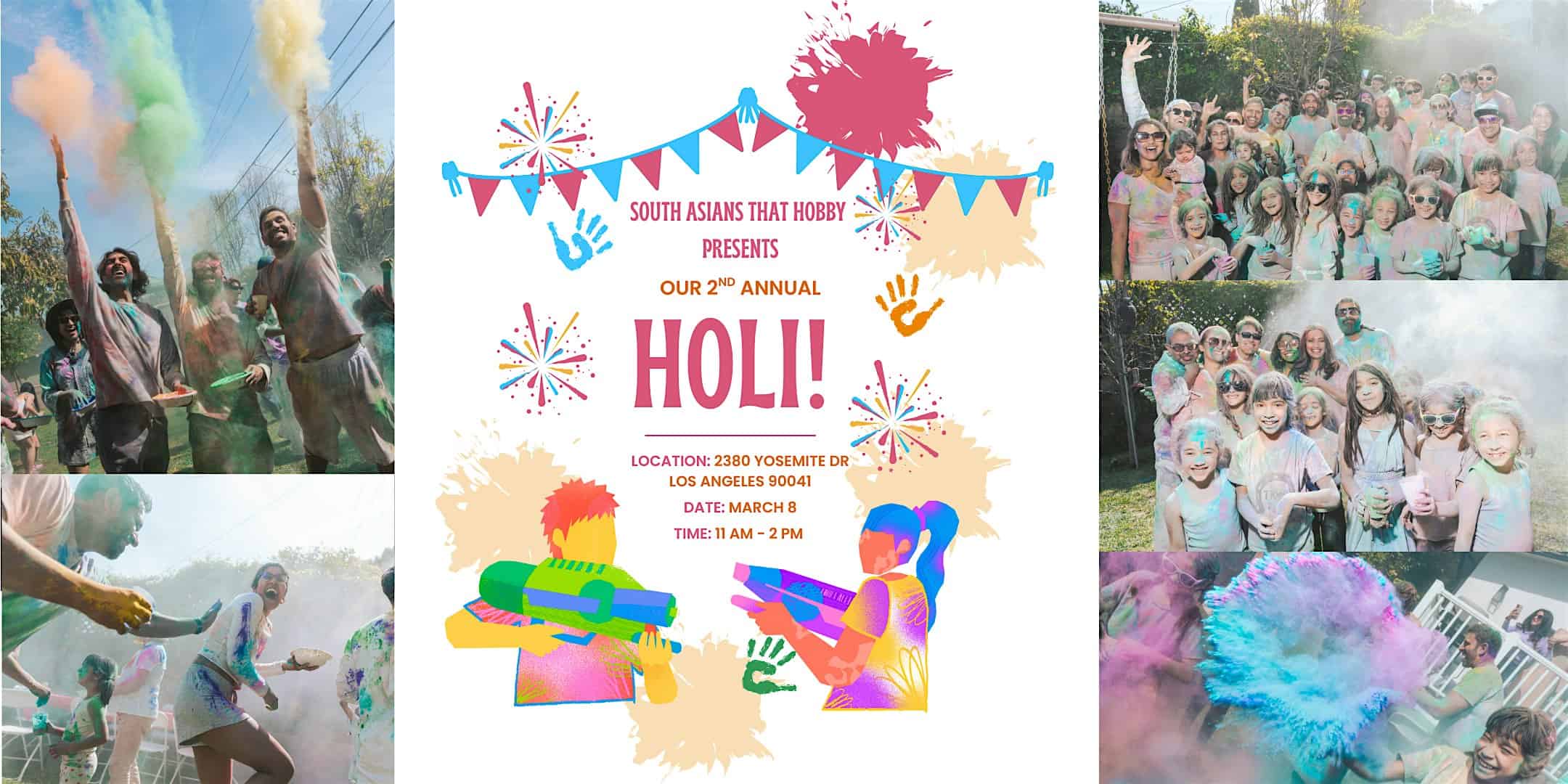 by admin23Feb SATH 2nd Annual Holi Party! at 2380 Yosemite Dr – Los Angeles, CA SATH 2nd Annual Holi Party! at 2380 Yosemite Dr – Los Angeles, CA 1 1 people viewed this event. SATH Holi is back! Celebrate the Festival of Colors on March 8 with vibrant fun, community, and joy Tickets-RSVP Link Date And Time Sunday, March 8th, 2026 @ 11:00 AM Location 2380 Yosemite Drive, Los Angeles, CA 90041 Event Types Community & CultureParty or Social Gathering Event Category CaliforniaLos Angeles Share With Friends Facebook Twitter Linkedin Xing Pinterest Share This Post: