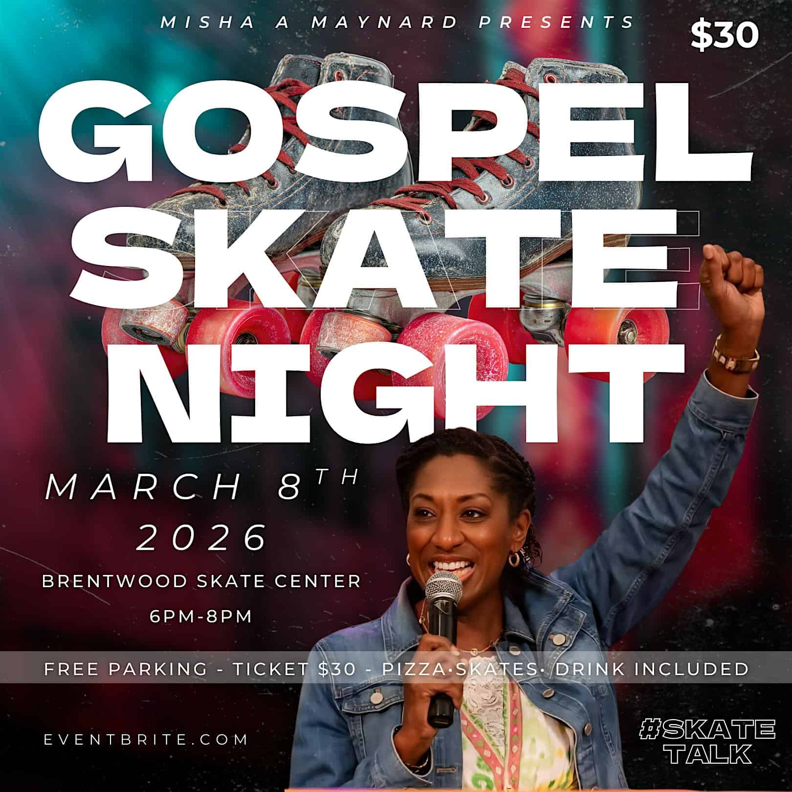 by admin23Feb Skate Talk Gospel Skating Party at Skate Center Brentwood – Brentwood, TN Skate Talk Gospel Skating Party at Skate Center Brentwood – Brentwood, TN 1 1 people viewed this event. Roll in for good vibes, gospel tunes, and fun times at the Skate Talk Gospel Skating Party—let’s skate and praise! Tickets-RSVP Link Date And Time Sunday, March 8th, 2026 @ 06:00 PM Location 402 Wilson Pike Circle, Brentwood, TN 37027 Event Types Community & CultureParty or Social Gathering Event Category Tennessee Share With Friends Facebook Twitter Linkedin Xing Pinterest Share This Post: