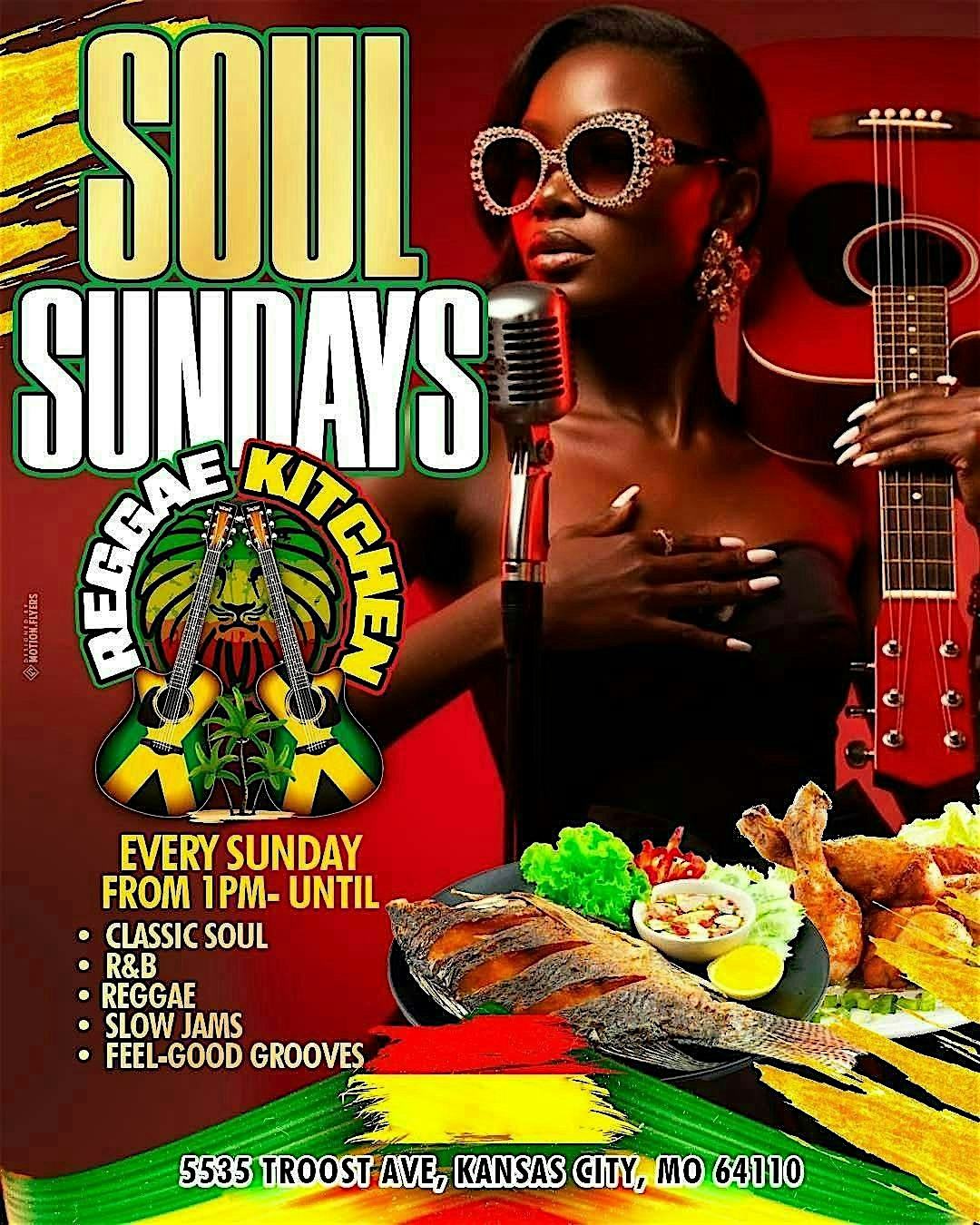 by admin27Feb Soul Sundays at Reggae Kitchen at Reggae Kitchen – Kansas City, MO Soul Sundays at Reggae Kitchen at Reggae Kitchen – Kansas City, MO 1 1 people viewed this event. Soul Sundays: Chill vibes, good tunes, and great people to lift your spirit every Sunday! Tickets-RSVP Link Date And Time Sunday, March 8th, 2026 01:00 PM (PST) Venue Reggae Kitchen Location 5535 Troost Avenue, Kansas City, MO 64110 Event Types MusicParty or Social Gathering Event Category Kansas CityMissouri Share With Friends Facebook Twitter Linkedin Xing Pinterest Share This Post: