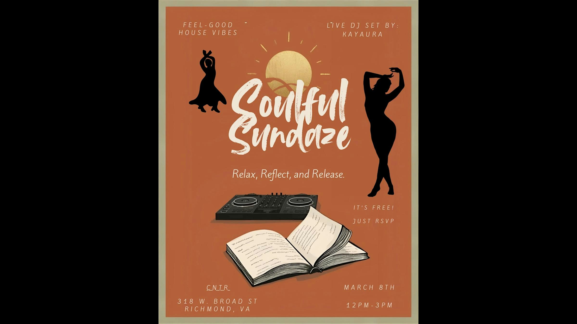 by admin27Feb Soulful Sundaze at CNTR: A Creative Event Venue – Richmond, VA Soulful Sundaze at CNTR: A Creative Event Venue – Richmond, VA 2 2 people viewed this event. Join me for a soul nourishing mix of feel-good house music, a collaborative reflection board, and a cozy space to dance or simply relax Tickets-RSVP Link Date And Time Sunday, March 8th, 2026 12:00 PM (PST) Venue CNTR: A Creative Event Venue Location 318 West Broad Street, Richmond, VA 23220 Event Types Concert or PerformanceMusic Event Category Virginia Share With Friends Facebook Twitter Linkedin Xing Pinterest Share This Post: