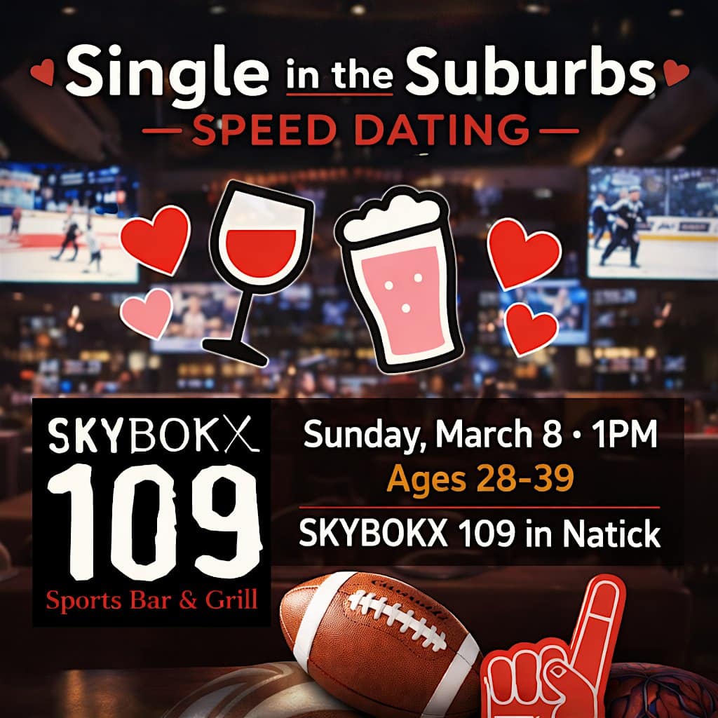 by admin23Feb Speed Dating at Skybokx 109 Natick **Age 28-39** at SKYBOKX 109 Sports Bar & Grill – Natick, MA Speed Dating at Skybokx 109 Natick **Age 28-39** at SKYBOKX 109 Sports Bar & Grill – Natick, MA 2 2 people viewed this event. Come meet local singles and have a blast on up to 12 mini dates Tickets-RSVP Link Date And Time Sunday, March 8th, 2026 01:00 PM (PST) Venue SKYBOKX 109 Sports Bar & Grill Location 319 Speen Street, Natick, MA 1760 Event Types Community & CultureParty or Social Gathering Event Category Massachusetts Share With Friends Facebook Twitter Linkedin Xing Pinterest Share This Post:
