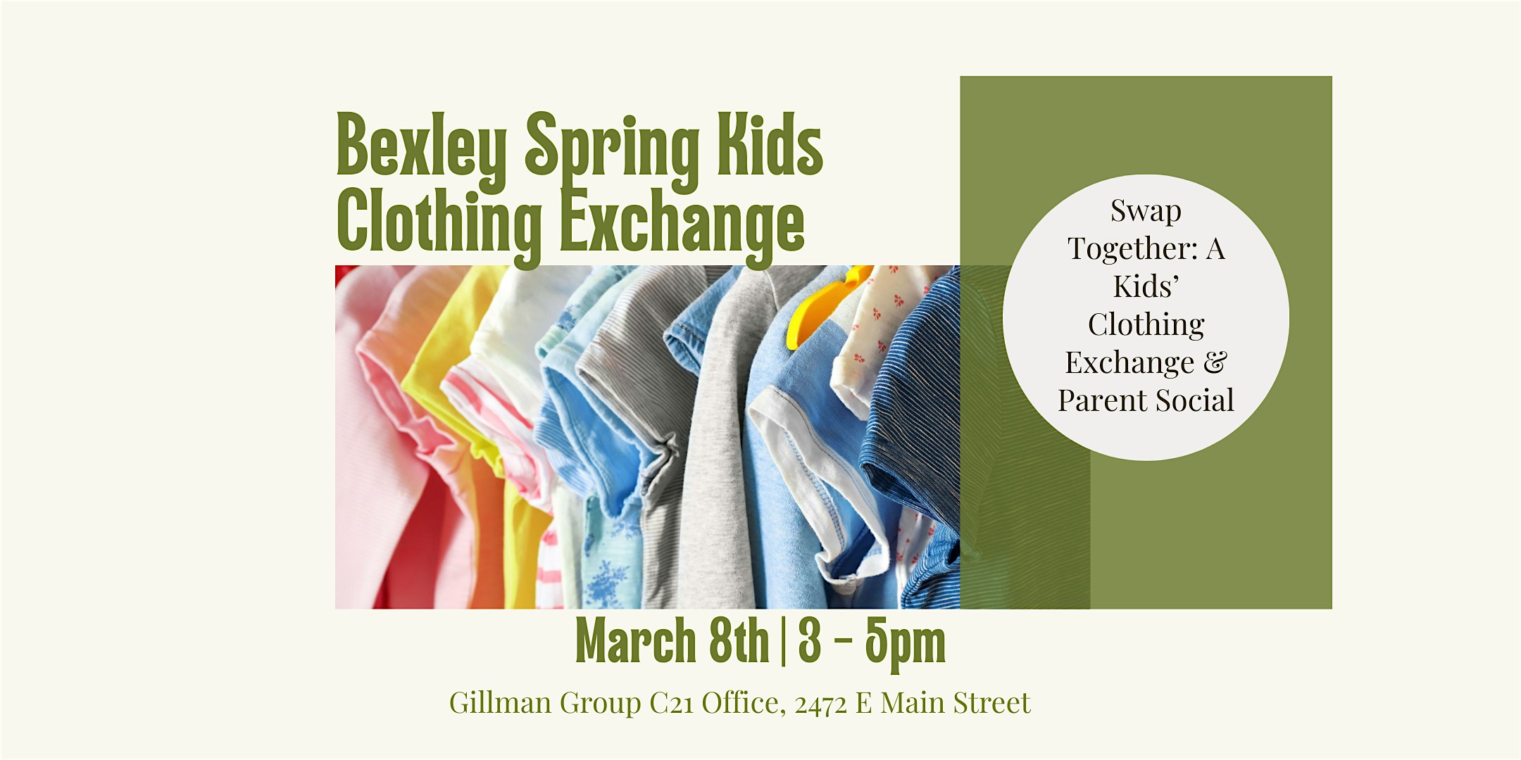 by admin12Feb Spring Kids Clothing Exchange! at The Gillman Group – Bexley, OH Spring Kids Clothing Exchange! at The Gillman Group – Bexley, OH 2 2 people viewed this event. Get ready to refresh your kids clothing just in time for spring break! Mingle with other adults in your community while you do so! Tickets-RSVP Link Date And Time Sunday, March 8th, 2026 07:00 PM (PST) Venue The Gillman Group Location 2472 East Main Street, Bexley, OH 43209 Event Types Fashion & BeautyParty or Social Gathering Event Category Ohio Share With Friends Facebook Twitter Linkedin Xing Pinterest Share This Post: