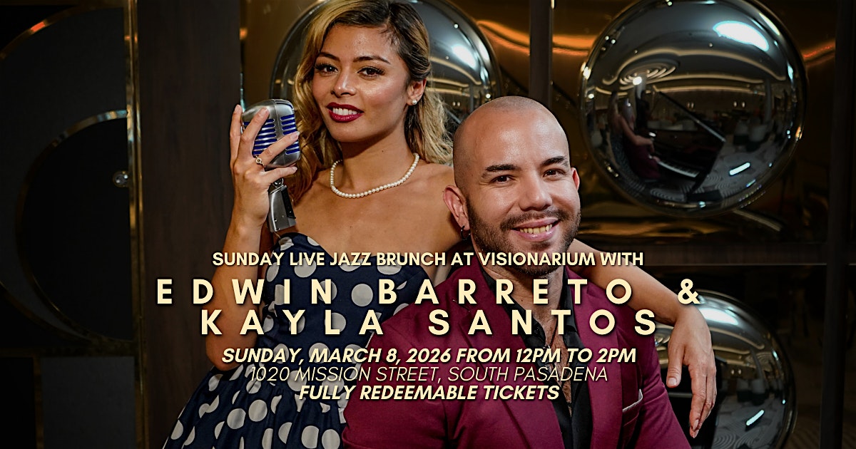 by admin23Feb Sunday Jazz Brunch at Visionarium with Edwin Barreto & Kayla Santos at 1020 Mission St – South Pasadena, CA Sunday Jazz Brunch at Visionarium with Edwin Barreto & Kayla Santos at 1020 Mission St – South Pasadena, CA 2 2 people viewed this event. Join us for a brunch experience that blends timeless elegance with modern flair right here in South Pasadena. Tickets-RSVP Link Date And Time Sunday, March 8th, 2026 12:00 PM (PST) Venue 1020 Mission St Location 1020 Mission Street, South Pasadena, CA 91030 Event Types Concert or PerformanceMusic Event Category CaliforniaLos Angeles Share With Friends Facebook Twitter Linkedin Xing Pinterest Share This Post: