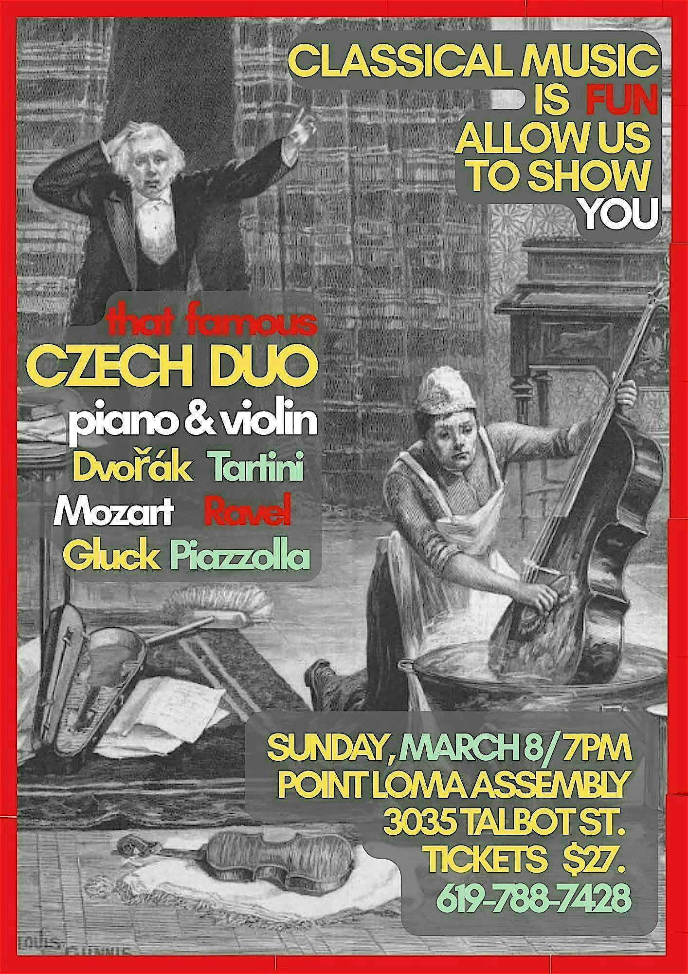 by admin23Feb That Famous Czech Duo: piano and violin in a fascinating program at point loma assembly – San Diego, CA That Famous Czech Duo: piano and violin in a fascinating program at point loma assembly – San Diego, CA 2 2 people viewed this event. Direct from the Czech Republic! Join us for an electrifying program for violin and piano! Tickets-RSVP Link Date And Time Sunday, March 8th, 2026 07:00 PM (PST) Venue point loma assembly Location 3035 Talbot, San Diego, CA 92106, San Diego, CA 92106 Event Types Concert or PerformanceMusic Event Category CaliforniaSan Diego Share With Friends Facebook Twitter Linkedin Xing Pinterest Share This Post: