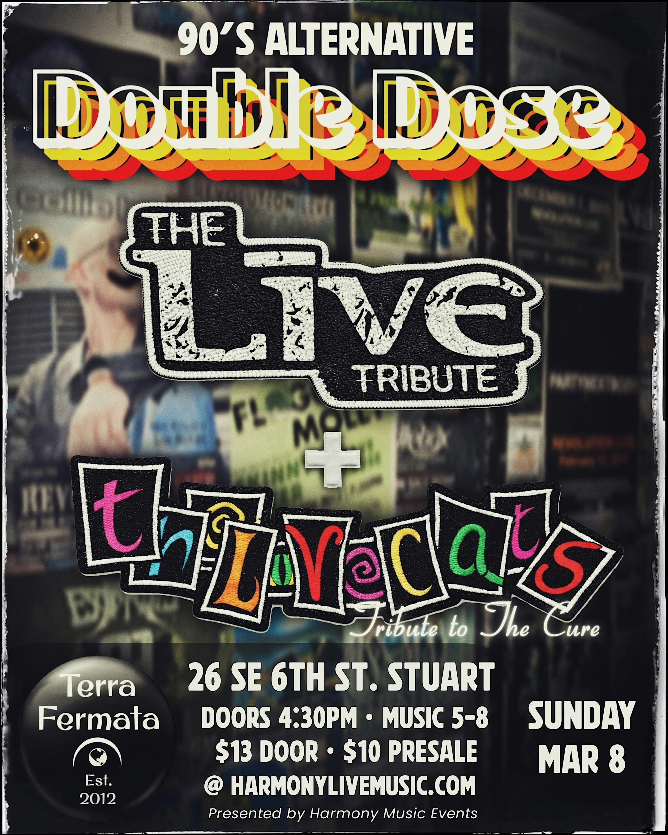 by admin27Feb THE CURE & ‘LIVE’ – Double Dose of 90’s Alternative Rock – 2 BANDS 1 SHOW! at Terra Fermata – Stuart, FL THE CURE & ‘LIVE’ – Double Dose of 90’s Alternative Rock – 2 BANDS 1 SHOW! at Terra Fermata – Stuart, FL 1 1 people viewed this event. ‘LIVE’ and ‘The Cure’ TRIBUTE BANDS play back to back with all the hits! 90’s Rock Fans this is your concert! Slashed to just $10 a ticket! Tickets-RSVP Link Date And Time Sunday, March 8th, 2026 04:00 PM (PST) Venue Terra Fermata Location 26 Southeast 6th Street, Stuart, FL 34994 Event Types Concert or PerformanceMusic Event Category Florida Share With Friends Facebook Twitter Linkedin Xing Pinterest Share This Post: