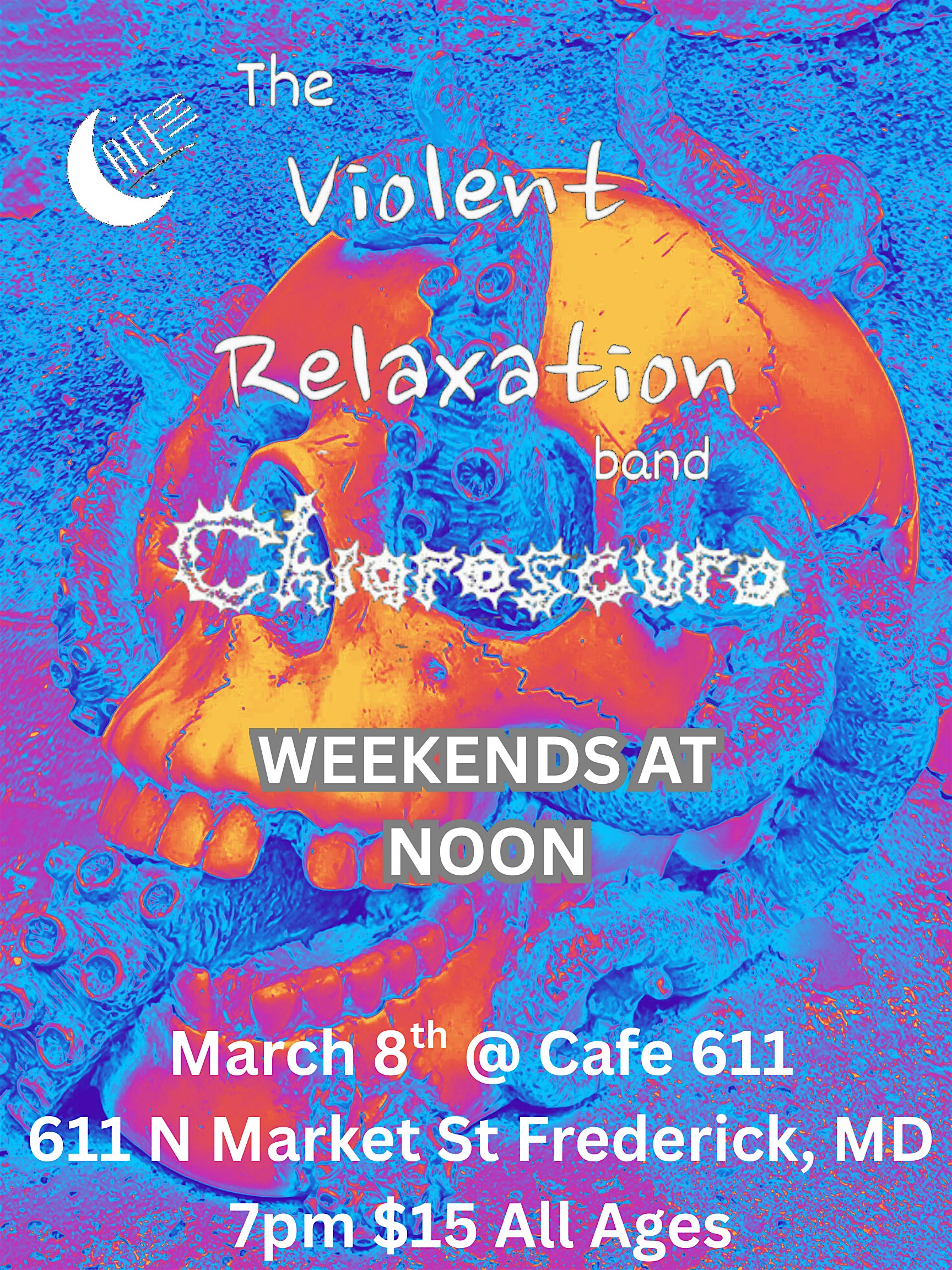 by admin13Feb The Violent Relaxation Band w/ Chiaroscuro and Weekends At Noon @ Cafe 611 at Cafe 611 Restaurant – Frederick, MD The Violent Relaxation Band w/ Chiaroscuro and Weekends At Noon @ Cafe 611 at Cafe 611 Restaurant – Frederick, MD 2 2 people viewed this event. The Violent Relaxation Band w/ Chiaroscuro and Weekends At Noon @ Cafe 611 Tickets-RSVP Link Date And Time Sunday, March 8th, 2026 11:00 PM (PST) Venue Cafe 611 Restaurant Location 611 North Market Street, Frederick, MD 21701 Event Types Concert or PerformanceMusic Event Category Maryland Share With Friends Facebook Twitter Linkedin Xing Pinterest Share This Post:
