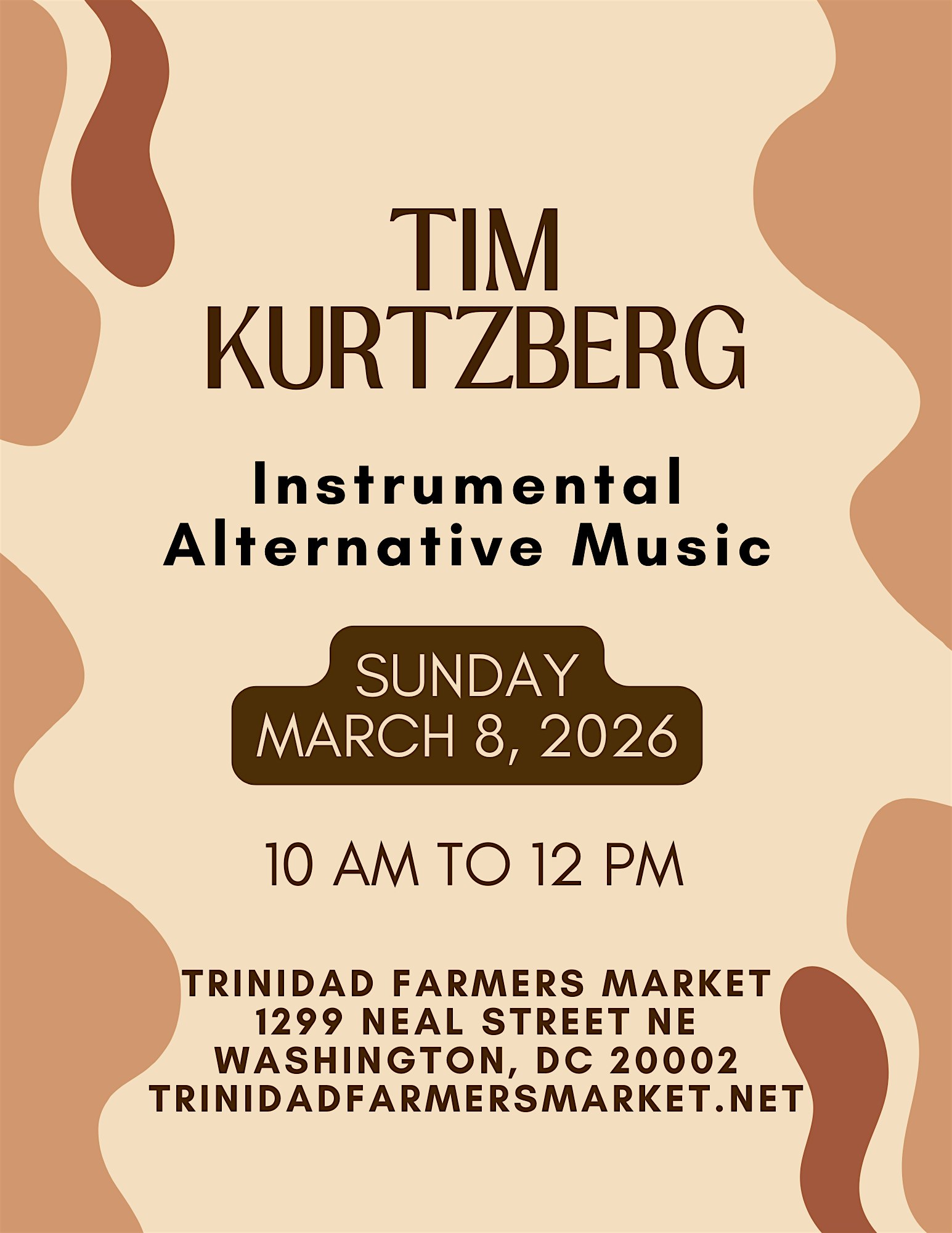 by admin27Feb Tim Kurtzberg Alternative Acoustic Music @ Trinidad Farmers Market (FREE) at 1299 Neal St NE – Washington, DC Tim Kurtzberg Alternative Acoustic Music @ Trinidad Farmers Market (FREE) at 1299 Neal St NE – Washington, DC 1 1 people viewed this event. Tim Kurtzberg will play some uplifting alternative acoustic music during the hours of Trinidad Farmers Market. FREE TO PUBLIC. Tickets-RSVP Link Date And Time Sunday, March 8th, 2026 10:00 AM (PST) Venue 1299 Neal St NE Location 1299 Neal Street Northeast, Washington, DC 20002 Event Types Concert or PerformanceMusic Event Category Washington DC Share With Friends Facebook Twitter Linkedin Xing Pinterest Share This Post: