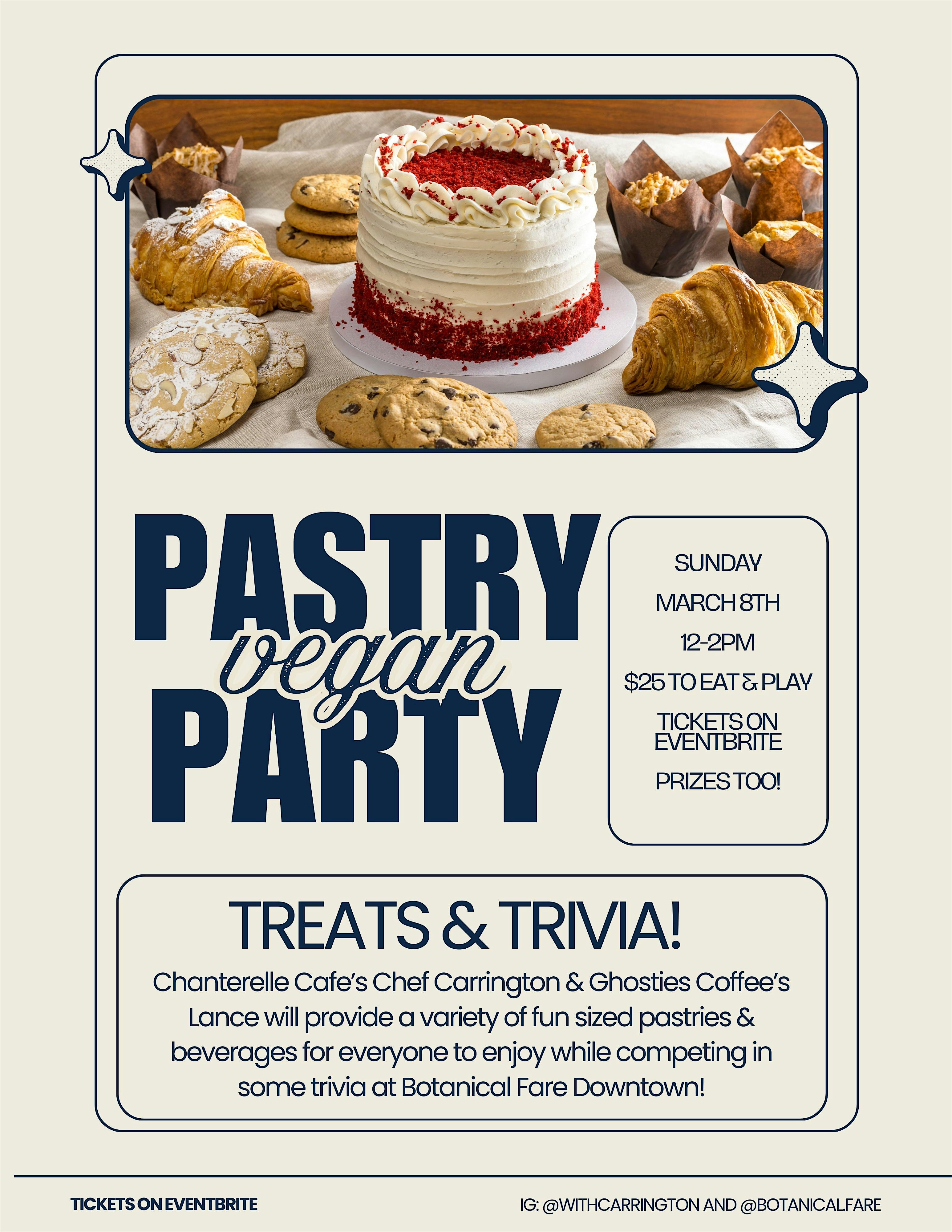 by admin27Feb Vegan Pastry Party (Chanterelle Cafe Pop-up) at Botanical Plant-Based Fare – Charlottesville, VA Vegan Pastry Party (Chanterelle Cafe Pop-up) at Botanical Plant-Based Fare – Charlottesville, VA 1 1 people viewed this event. It’s a pastry party! Come get a sampling of vegan pastries & craft coffee while enjoying trivia, relaxing, or socializing! (downtown cville) Tickets-RSVP Link Date And Time Sunday, March 8th, 2026 12:00 PM (PST) Venue Botanical Plant-Based Fare Location 421 East Main Street, Charlottesville, VA 22902 Event Types Food & DrinkParty or Social Gathering Event Category Virginia Share With Friends Facebook Twitter Linkedin Xing Pinterest Share This Post: