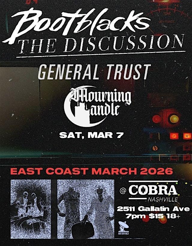 by admin14Feb Venue: Bootblacks | The Discussion | General Trust | Mourning Candle at Cobra Nashville – Nashville, TN Venue: Bootblacks | The Discussion | General Trust | Mourning Candle at Cobra Nashville – Nashville, TN 2 2 people viewed this event. 18 and UP + Tickets-RSVP Link Date And Time Sunday, March 8th, 2026 01:00 AM (PST) Venue Cobra Nashville Location 2511 Gallatin Avenue, Nashville, TN 37206 Event Types Concert or PerformancePerforming & Visual Arts Event Category NashvilleTennessee Share With Friends Facebook Twitter Linkedin Xing Pinterest Share This Post: