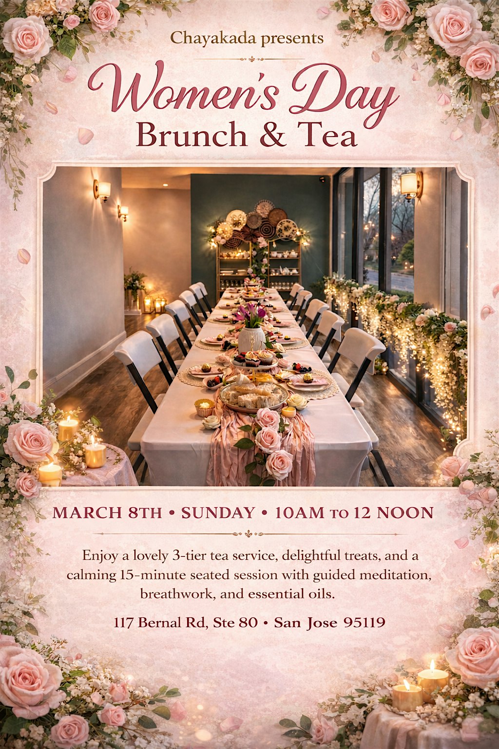 by admin23Feb Women’s Day Luxury Brunch and Tea at Chayakada – San Jose, CA Women’s Day Luxury Brunch and Tea at Chayakada – San Jose, CA 3 3 people viewed this event. Enjoy an elegant three-tier tea service featuring savory bites, handcrafted sweets, and premium tea blends in an elegantly styled setting Tickets-RSVP Link Date And Time Sunday, March 8th, 2026 10:00 AM (PST) Venue Chayakada Location 117 Bernal Road, San Jose, CA 95119 Event Types Food & Drink Event Category CaliforniaSan Jose Share With Friends Facebook Twitter Linkedin Xing Pinterest Share This Post: