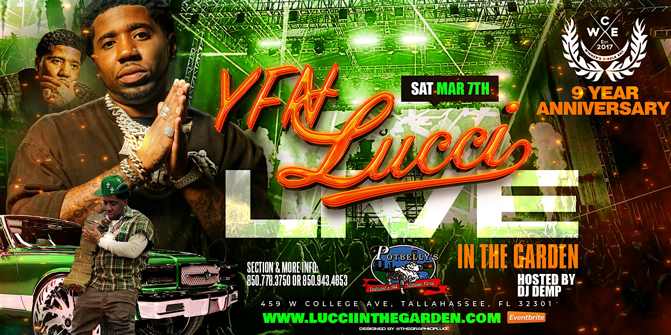 by admin13Feb YFN LUCCI LIVE IN THE GARDEN: WINNERS CIRCLE 9 YEAR ANNIVERSARY at POTBELLY’S – Tallahassee, FL YFN LUCCI LIVE IN THE GARDEN: WINNERS CIRCLE 9 YEAR ANNIVERSARY at POTBELLY’S – Tallahassee, FL 3 3 people viewed this event. Join us for the official 9th Year Anniversary Celebration of Winners Circle Entertainment LLC Tickets-RSVP Link Date And Time Sunday, March 8th, 2026 02:00 AM (PST) Venue POTBELLY'S Location 459 West College Avenue, Tallahassee, FL 32301 Event Types Concert or PerformanceMusic Event Category FloridaTallahassee Share With Friends Facebook Twitter Linkedin Xing Pinterest Share This Post: