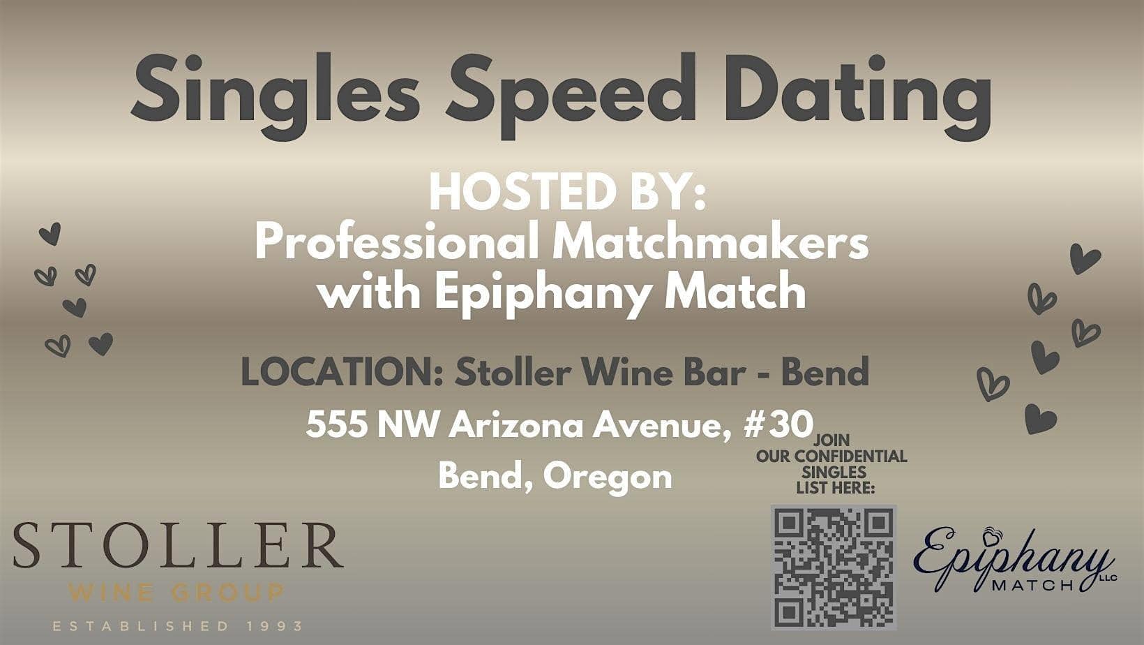 by admin23Feb 3/9/26 Singles Speed Dating (ages 25ish-50ish) at Stoller Wine Bar – Bend, OR 3/9/26 Singles Speed Dating (ages 25ish-50ish) at Stoller Wine Bar – Bend, OR 1 1 people viewed this event. Get ready to meet potential matches at our Speed Dating event (ages 25ish-50ish) – who knows, you might just find your perfect match! Tickets-RSVP Link Date And Time Monday, March 9th, 2026 @ 06:00 PM Location 555 Northwest Arizona Avenue, Bend, OR 97701 Event Types Community & CultureParty or Social Gathering Event Category Oregon Share With Friends Facebook Twitter Linkedin Xing Pinterest Share This Post: