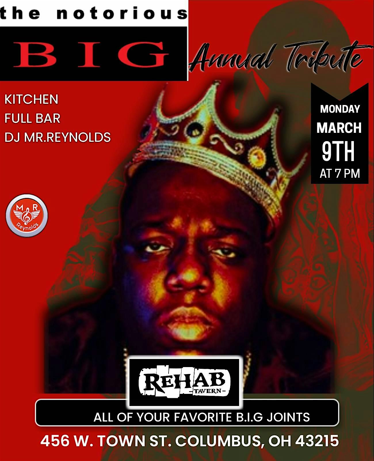 by admin27Feb 9th Annual NOTORIOUS BIG TRIBUTE at Rehab Tavern – Columbus, OH 9th Annual NOTORIOUS BIG TRIBUTE at Rehab Tavern – Columbus, OH 1 1 people viewed this event. THE 9TH ANNUAL NOTORIOUS B.I.G TRIBUTE PRESENTED BY DJ MR.REYNOLDS Tickets-RSVP Link Date And Time Monday, March 9th, 2026 @ 07:00 PM Location 456 West Town Street, Columbus, OH 43215 Event Types MusicOther Event Category Ohio Share With Friends Facebook Twitter Linkedin Xing Pinterest Share This Post: