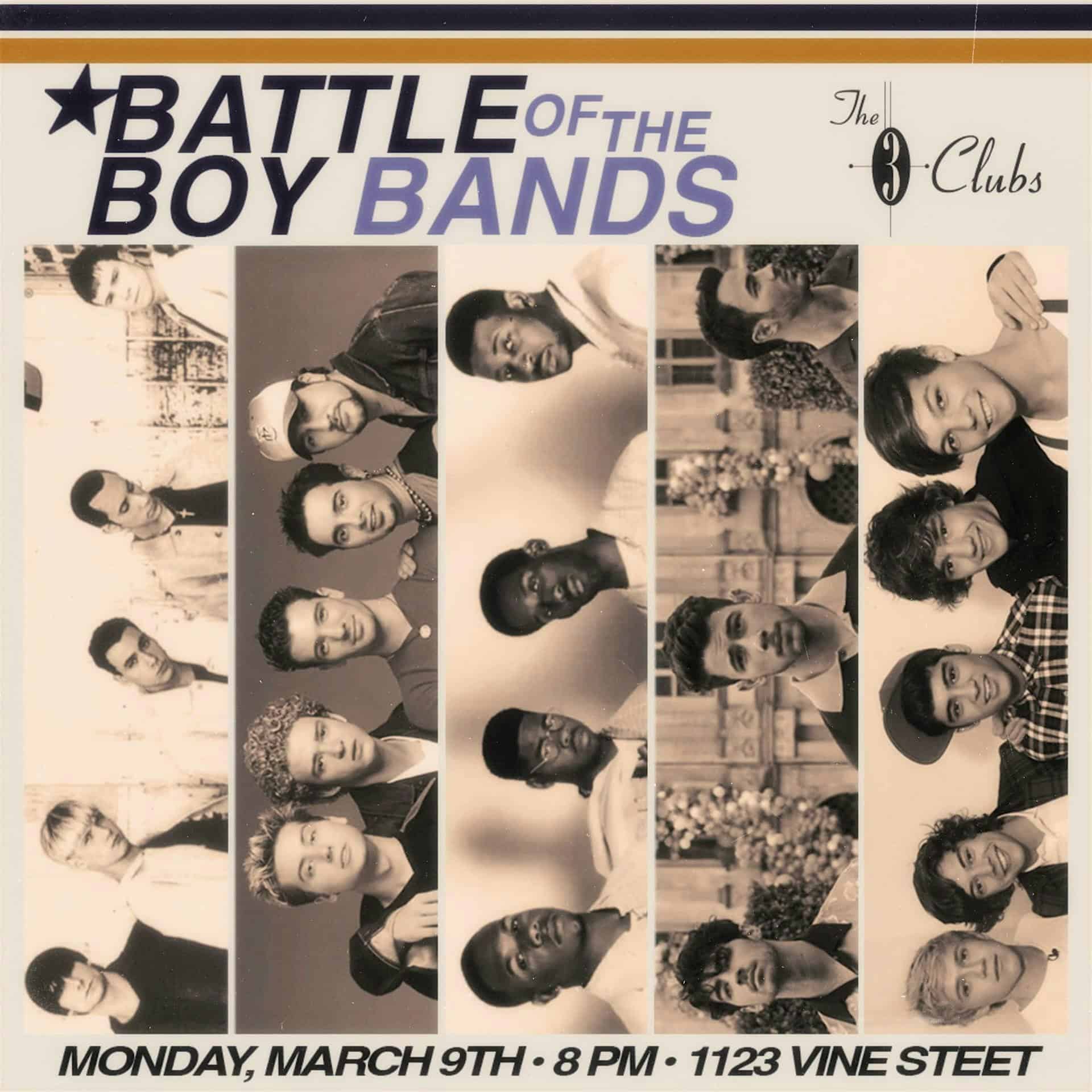 by admin23Feb Battle of the Boy Bands at The Three Clubs – Los Angeles, CA Battle of the Boy Bands at The Three Clubs – Los Angeles, CA 1 1 people viewed this event. Backstreet Boys vs. *NSYNC. Boyz II Men vs. BTS. Hanson vs. Jonas. Hear the hits live, performed by a powerhouse cast of LA vocalists! Tickets-RSVP Link Date And Time Monday, March 9th, 2026 08:00 PM (PST) Venue The Three Clubs Location 1123 Vine Street, Los Angeles, CA 90038 Event Types Concert or PerformanceMusic Event Category CaliforniaLos Angeles Share With Friends Facebook Twitter Linkedin Xing Pinterest Share This Post: